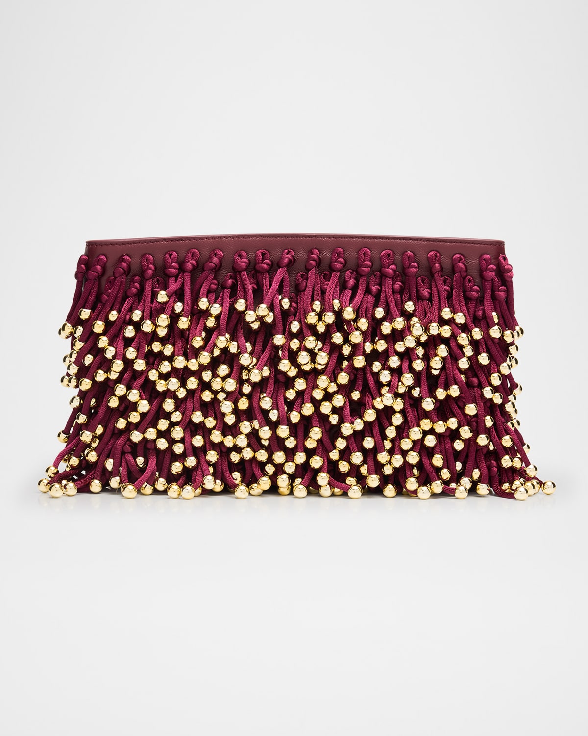 The "Reese" clutch bag from SIMKHAI is decorated all over with knotted fringe, capped with metallic beads for elevated texture Detachable chain shoulder strap Can be worn as a clutch or shoulder bag Zip top closure Interior, three slip pockets Lining: Polyester Approx. 5.5"H x 9.6"W x 1.5"D ABS Imported