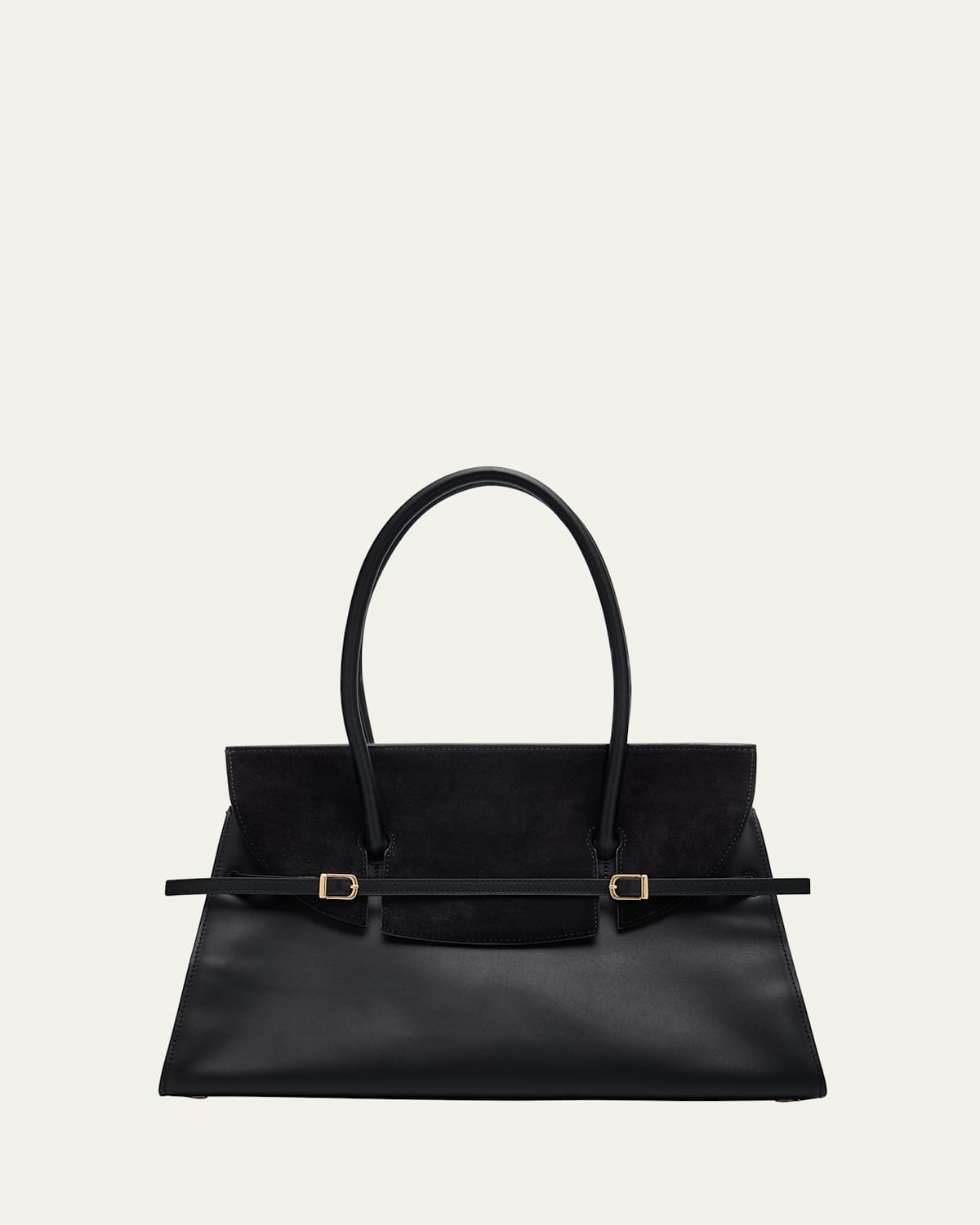 Designed with a suede flap for soft contrast, this structured SIMKHAI "River" shoulder bag is crafted in leather and features a wraparound double buckle belt strap for a cinched silhouette Rolled shoulder straps, 8.3" drop Flap top with magnetic closure Interior, one zip pocket, two slip pockets Feet protect the bottom of the bag Lining: Polyester Trim: Leather Approx. 9.6"H x 15"W x 7.5"D Imported