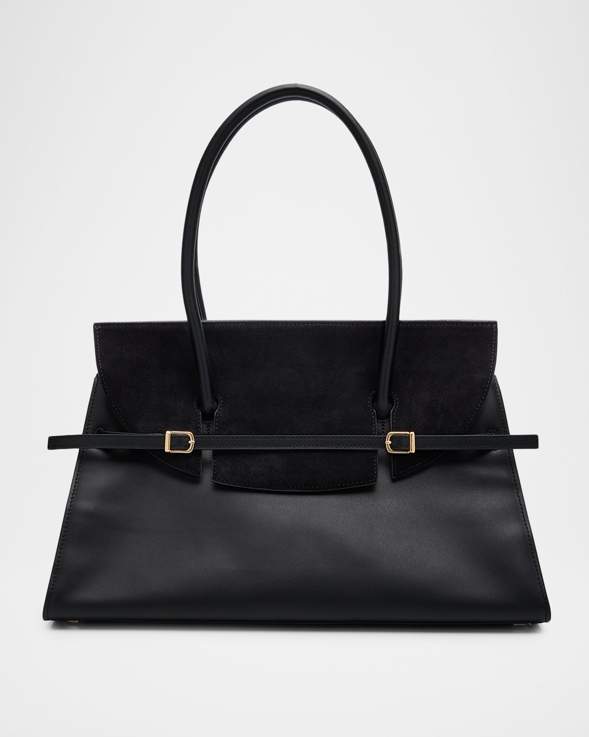 Designed with a suede flap for soft contrast, this structured SIMKHAI "River" shoulder bag is crafted in leather and features a wraparound double buckle belt strap for a cinched silhouette Rolled shoulder straps, 8.3" drop Flap top with magnetic closure Interior, one zip pocket, two slip pockets Feet protect the bottom of the bag Lining: Polyester Trim: Leather Approx. 9.6"H x 15"W x 7.5"D Imported