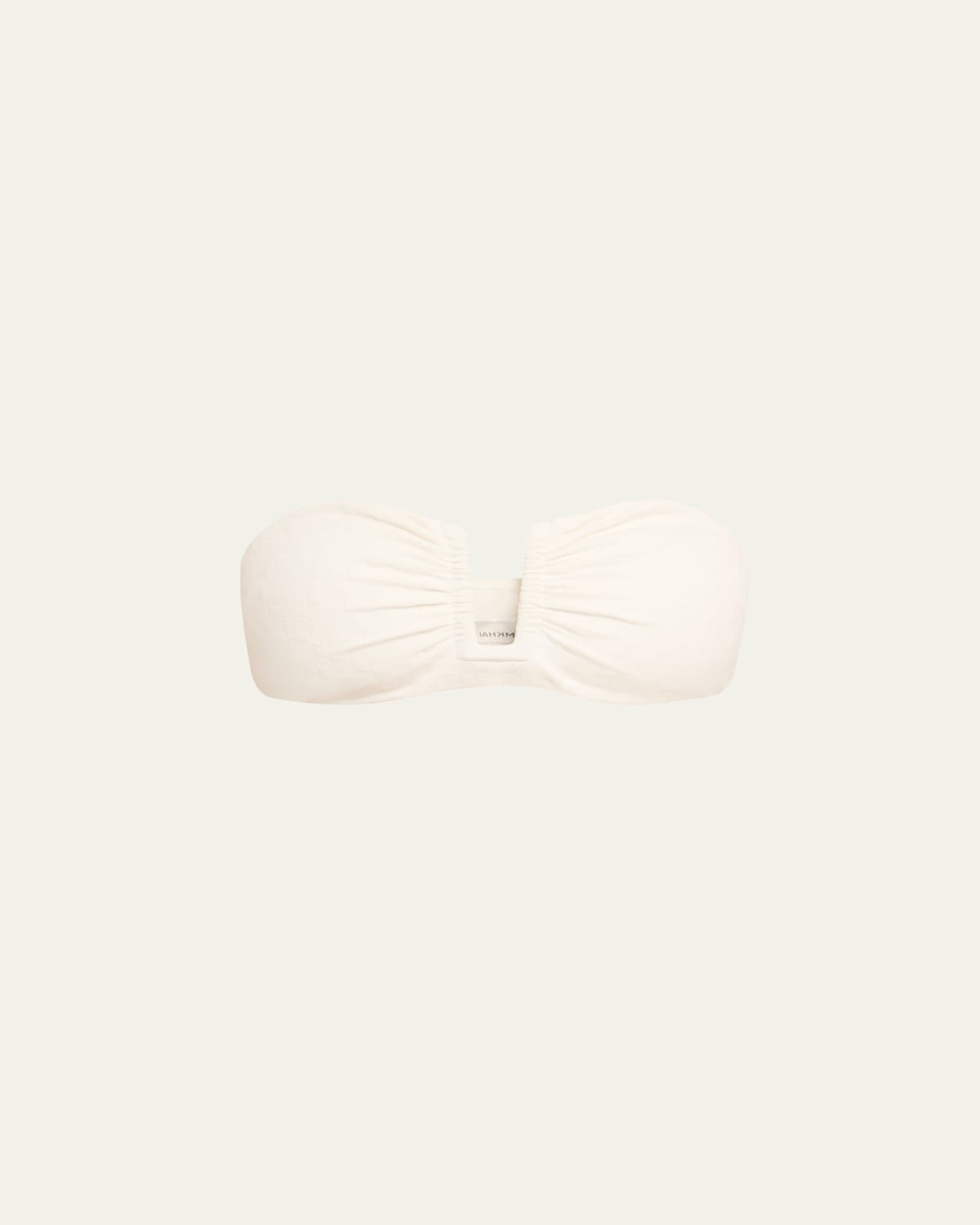 Accented with a central V cutout, the "Sandra" textured jacquard bikini top by SIMKHAI features flattering ruching through the bust Strapless neckline Pullover style Polyester/spandex/nylon/polyamide Imported Bottoms sold separately