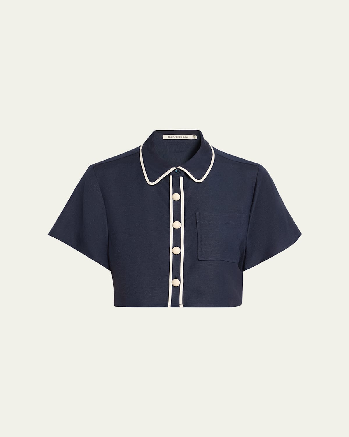 SIMKHAI "Solange" shirt with contrasting trim Spread collar; button front Short sleeves Chest patch pocket Yoked back Cropped hem Relaxed fit Linen/viscose Imported