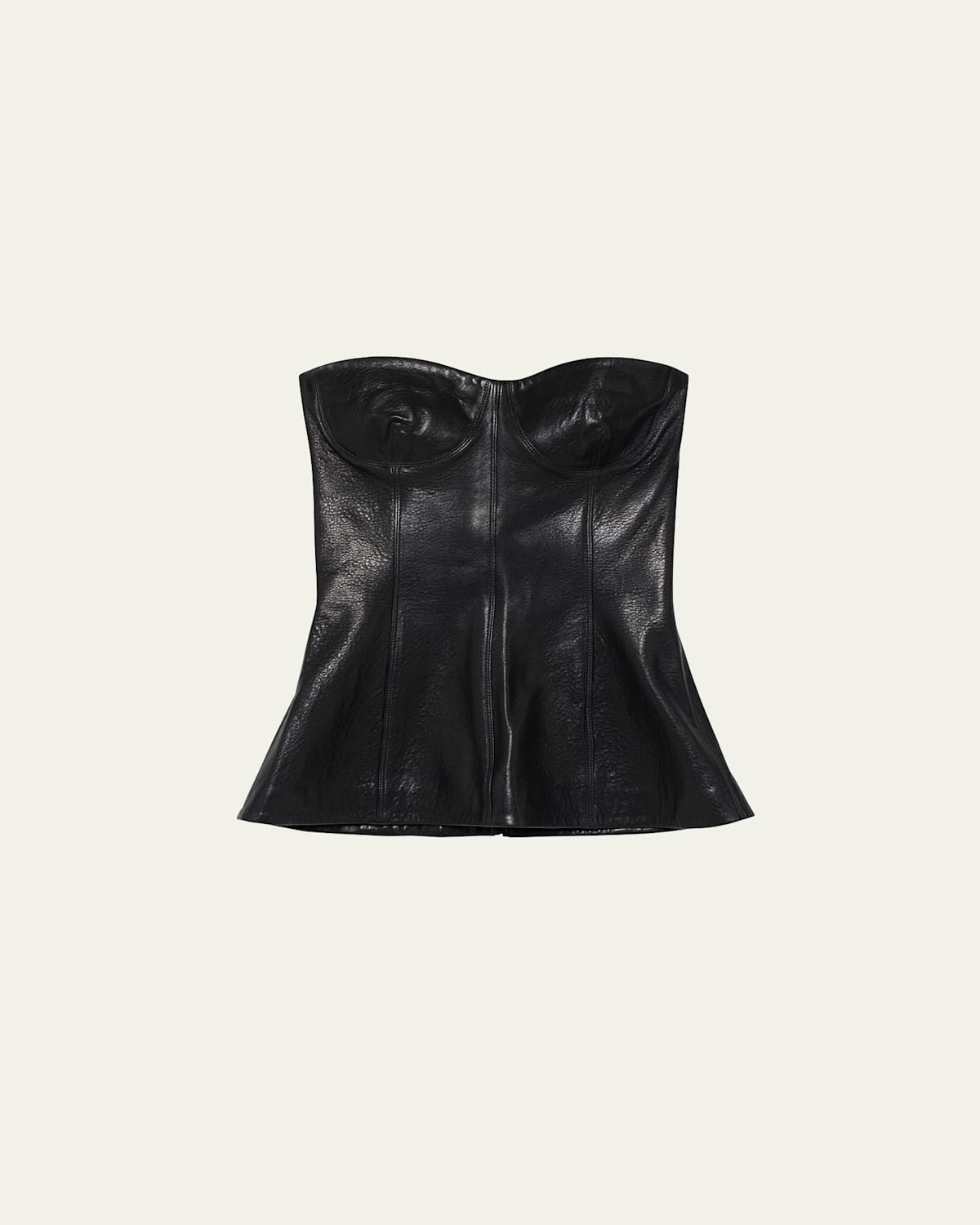SIMKHAI "Tyla" strapless bustier in paneled leather Sweetheart neckline Sleeveless Fitted Hem falls to the hip Center back zip Leather/viscose/cotton Professional cleaning recommended Imported