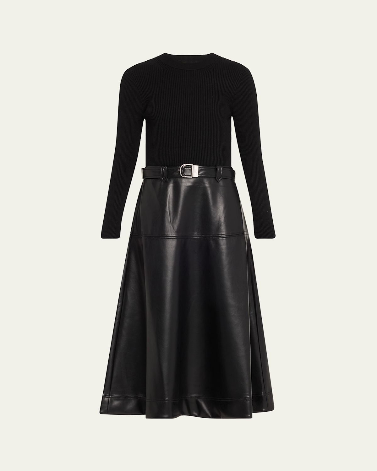 Ulyssia Belted Knit and Faux-Leather Combo Midi Dress