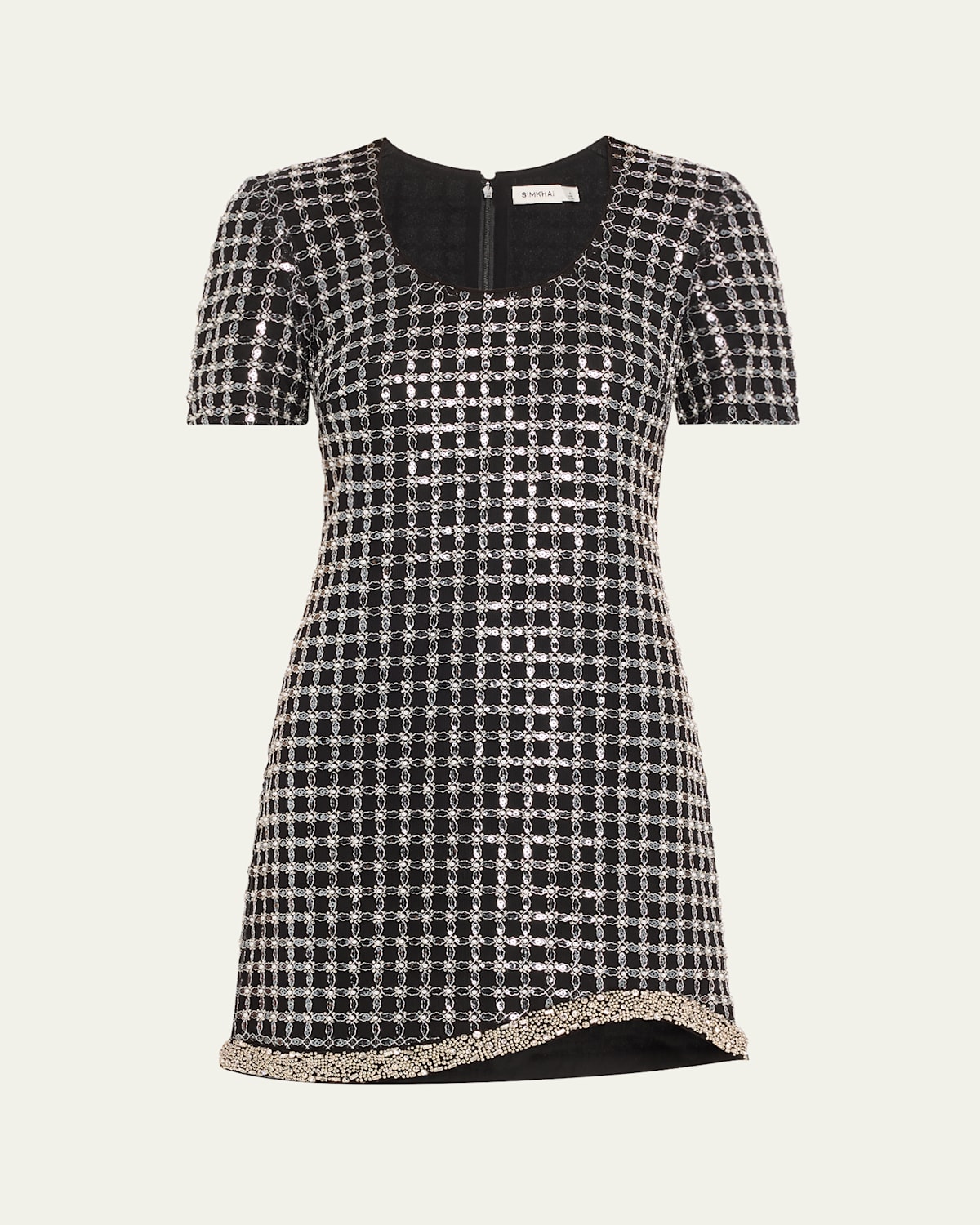 SIMKHAI "Vivalie" beaded mini dress featuring a wavy hem Scoop neckline Short sleeves Shift silhouette Hem falls above the knee Invisible back zip Nylon/polyamide Lining: Polyester Dry clean Imported