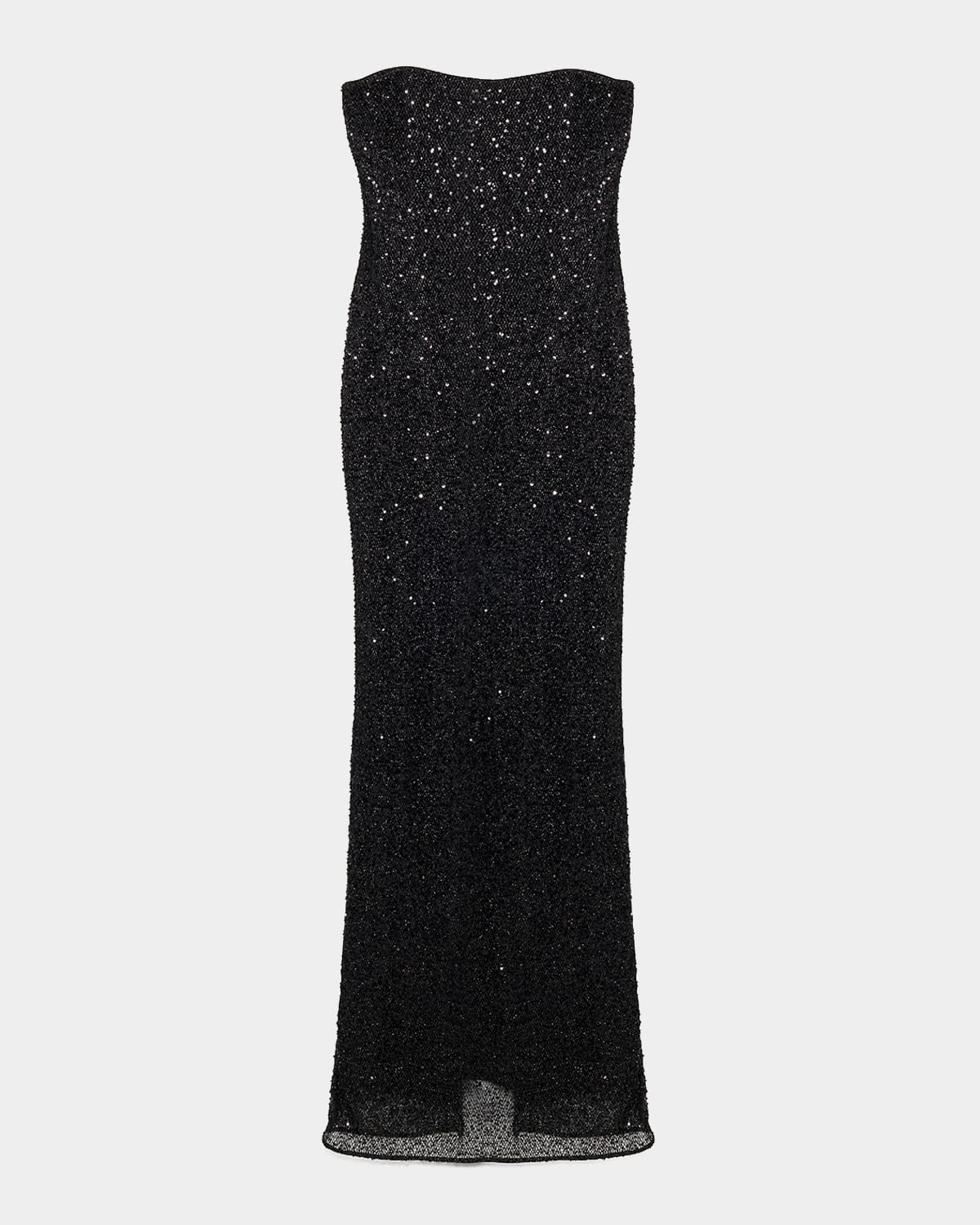 The "Xyla" gown from SIMKHAI is cut in a clean shape and layered with a textural sequin net overlay Approx. 52"L from neckline to hem Strapless neckline Sleeveless Center back slit Full length Column silhouette Invisible back zipper Nylon/polyamide/polyester Dry clean Imported