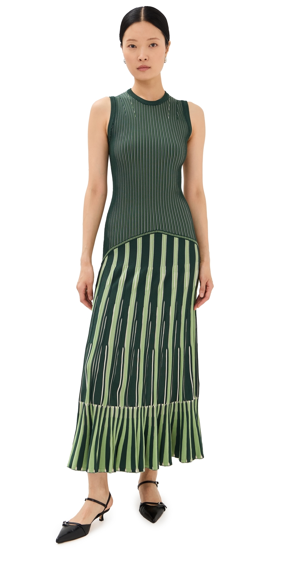 Fabric: Mid-weight, super-stretch ribbed knit. Tiered stripe pattern. Ruffle hem. Crew neck. Sleeveless. Pullover design, no closure. Shell: 83% rayon/17% polyester. Unlined. Dry clean. Imported, China. Measurements: Measurements from size XS Length: 51.25in / 130.0cm, from shoulder