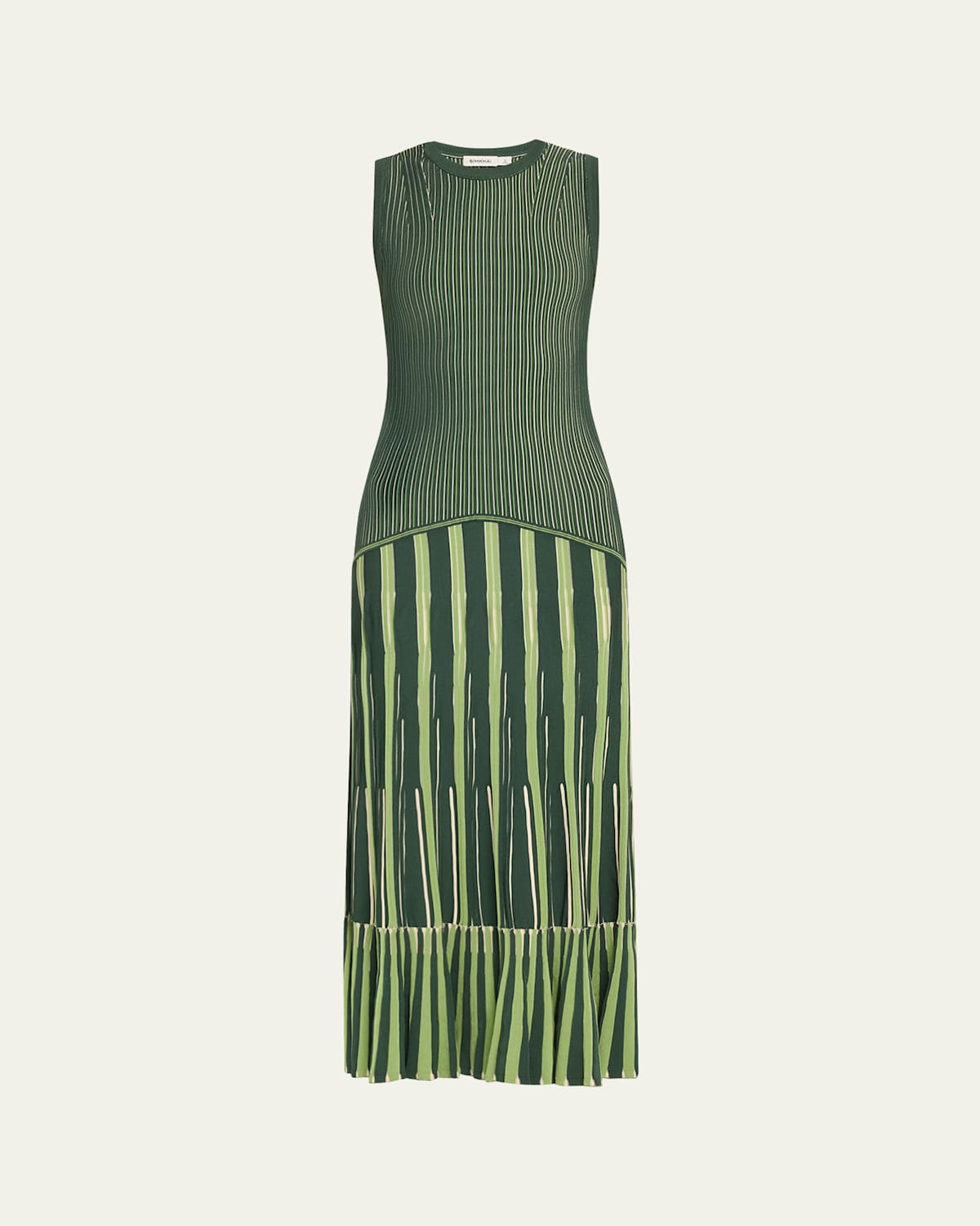 SIMKHAI "Zhane" maxi dress featuring a multistripe motif Crew neckline Sleeveless Fitted silhouette Flounce hem Slipover style Rayon/cellulose acetate/polyester Dry clean Imported