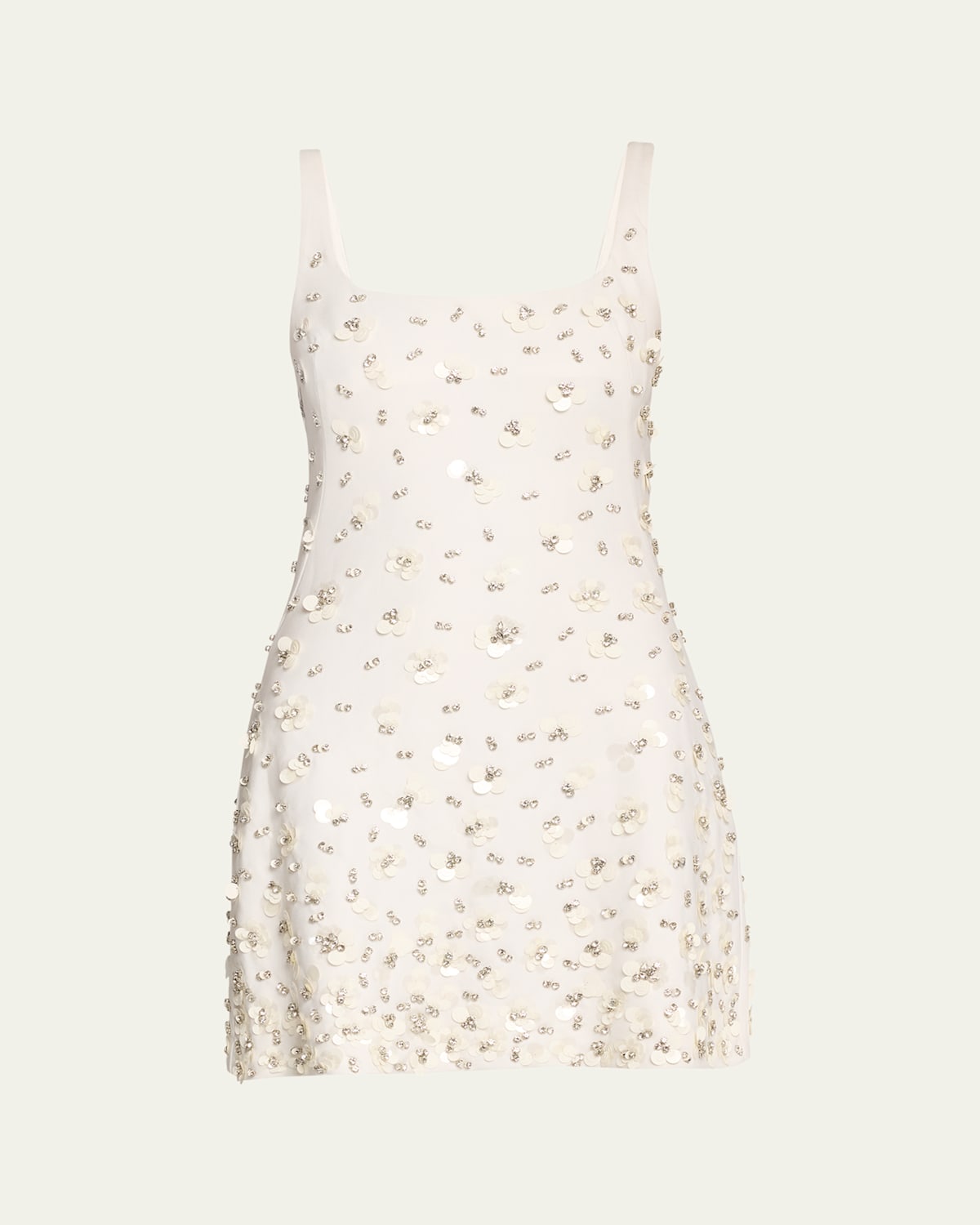 SIMKHAI "Ziva" cocktail dress decorated with shimmering sequin paillettes Square neckline Wide straps Hem hits above the knee Fit amp; flare silhouette Invisible back zipper Acetate/polyester Lining: Polyester Dry clean Made in USA