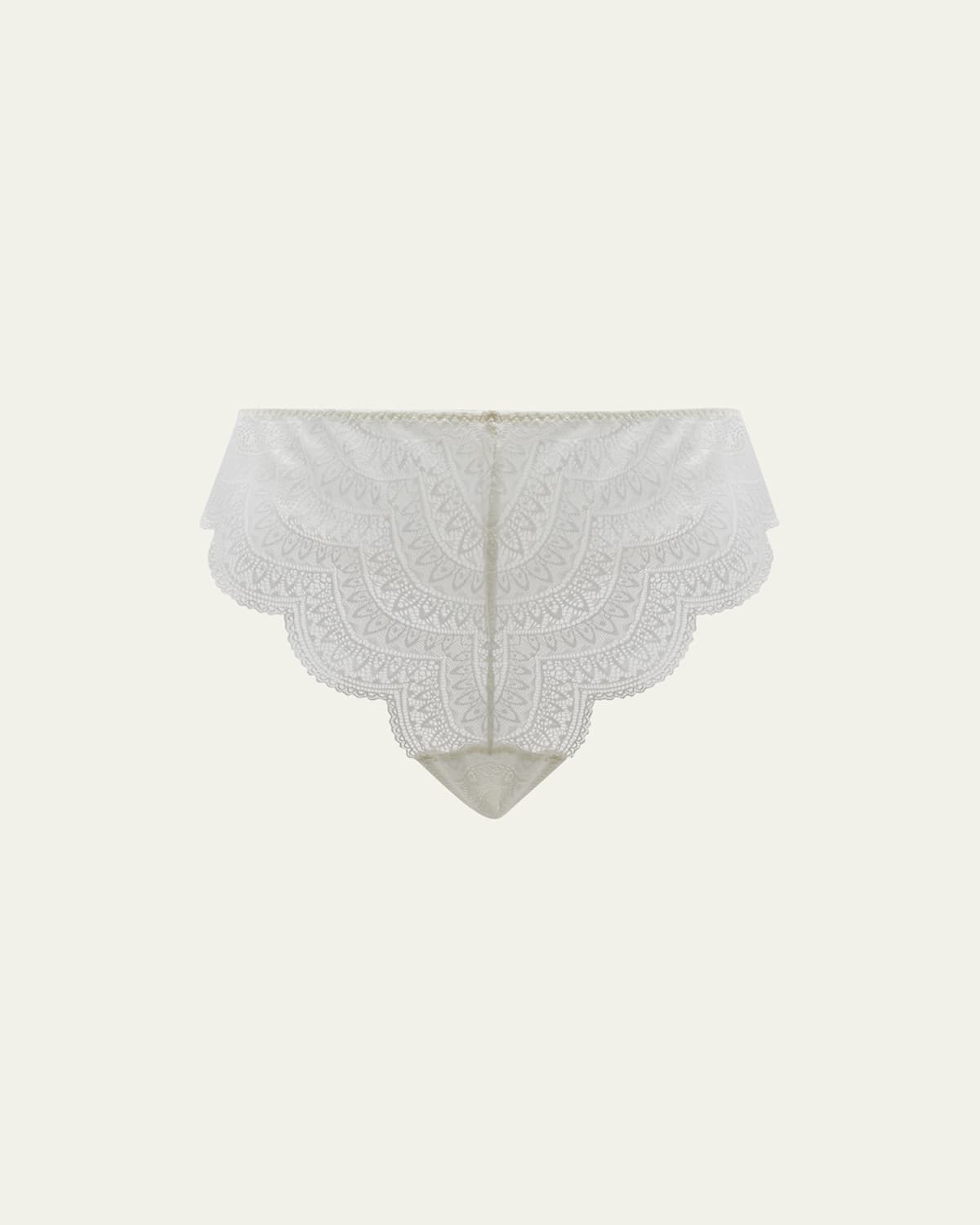 Simone Perele "Karma" patterned lace bra with convertible shoulder straps. Lace demi cups with underwire support and scalloped edging. Adjustable straps can be worn traditionally or crossed at back. Keyhole center front. Back hookandeye closure. Nylon/spandex. Hand wash. Imported.