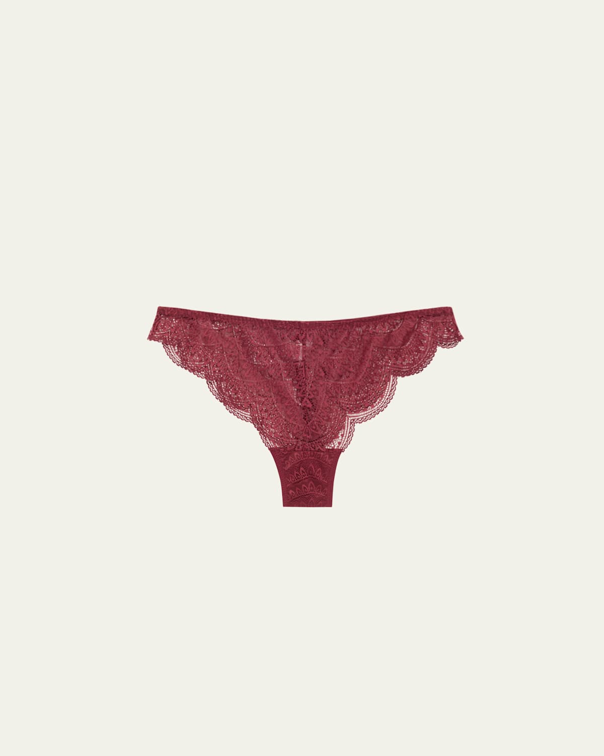Simone Perele "Karma" patterned lace thong with scalloped edging. Minimal seat coverage. Sheer coverage. Nylon/spandex. Hand wash. Imported.