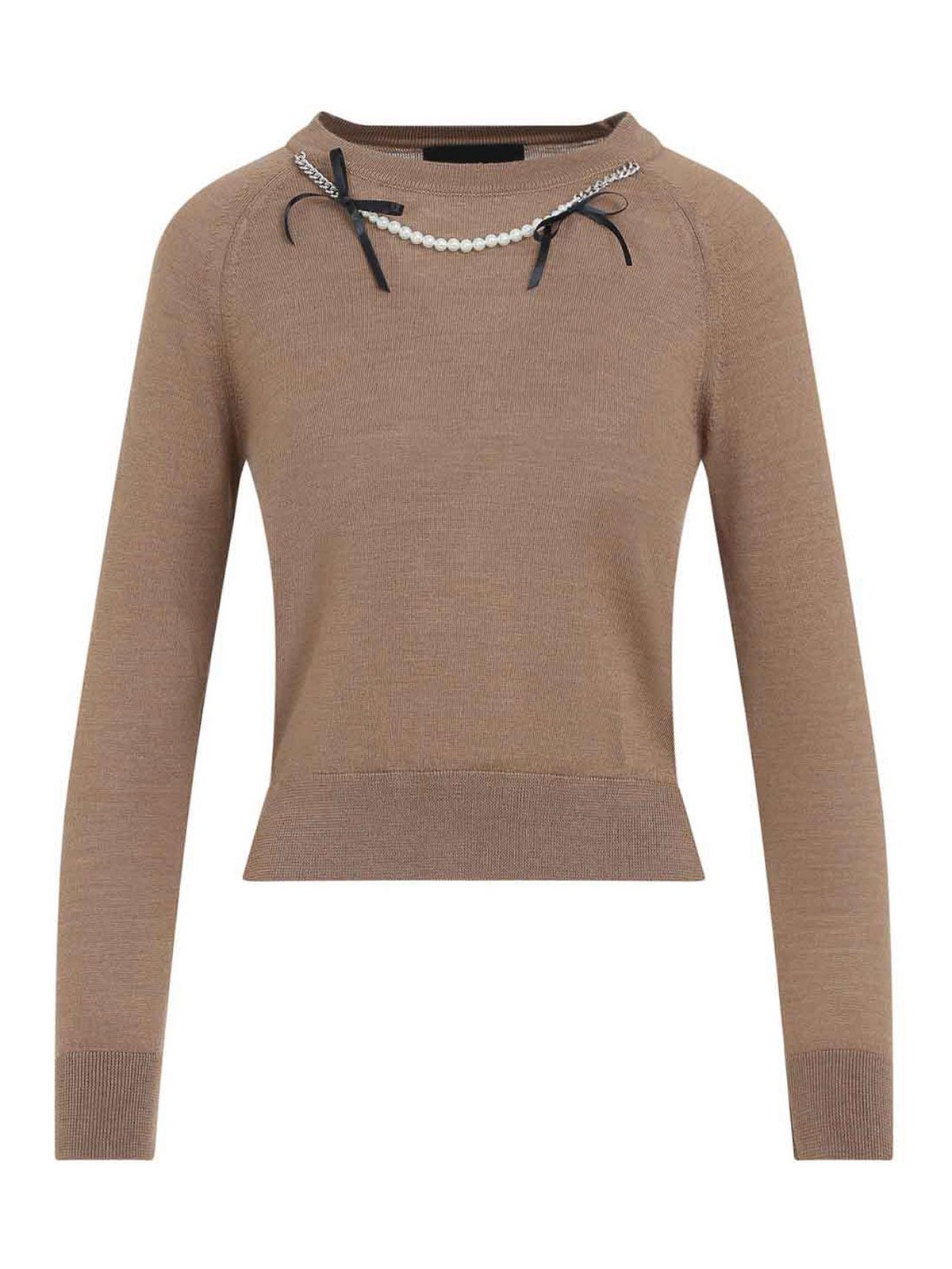 Pull classique et pull Simone Rocha en beige et encolure ronde, nauds noirs, chaînes et perles, manches longues raglan, bords côtelés fins.