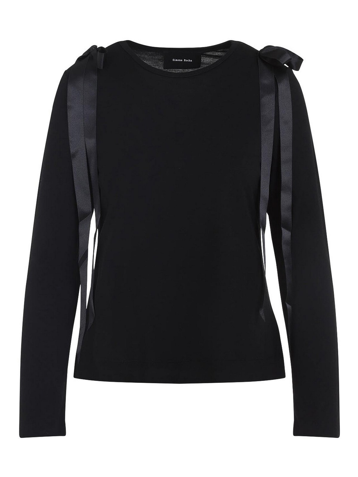T-shirt noir à ruban à naud Simone Rocha confectionné à partir de noir, encolure ronde, manches longues, ornements de nauds sur les épaules, ourlet droit