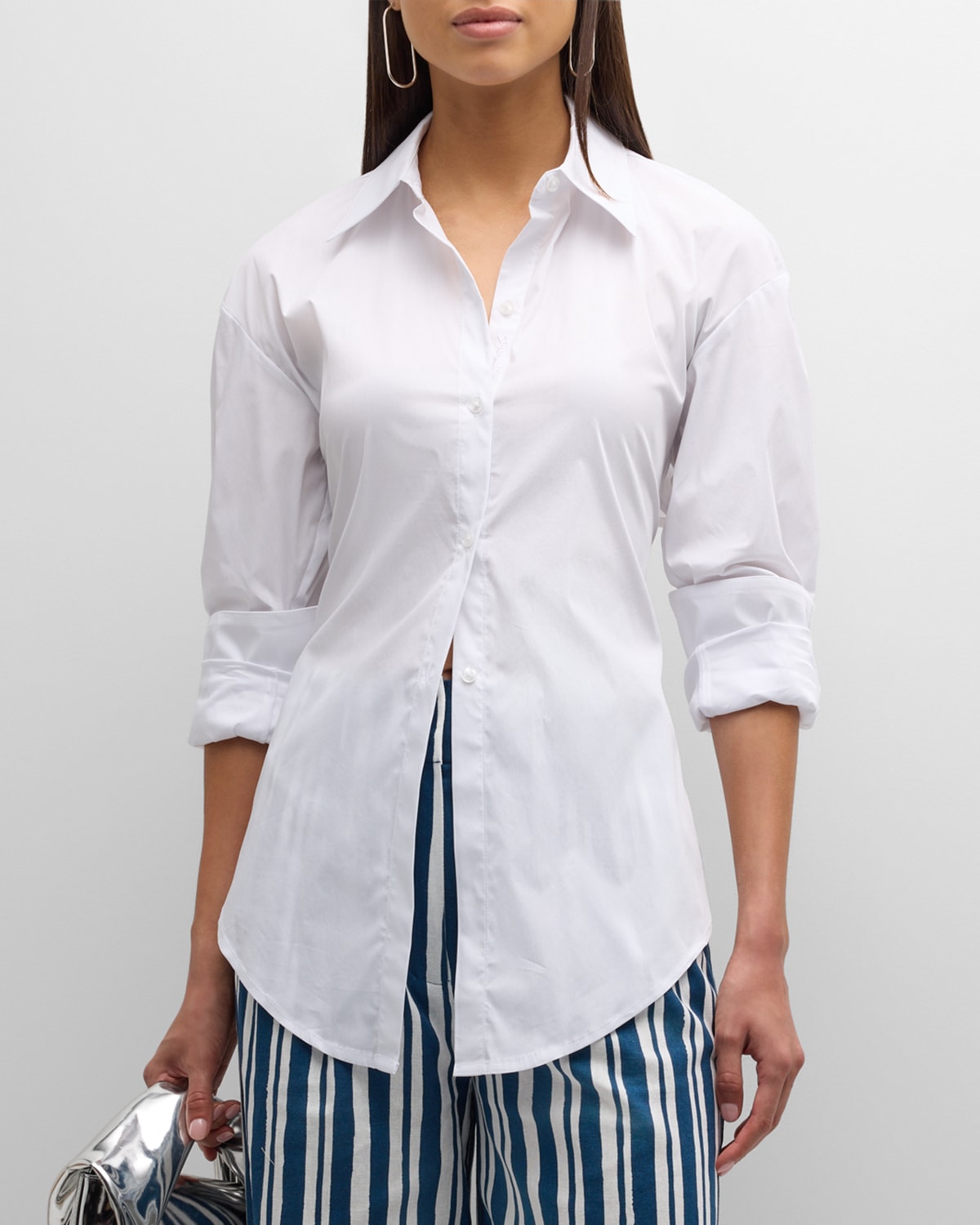SIMONMILLER "Loch" stretch poplin shirt with a cutout back and adjustable tie Approx. 30"L from shoulder to hem Spread collar; button placket Long sleeves; button cuffs Tailored fit Hits below the hips Cotton/nylon/spandex Machine wash cold Imported