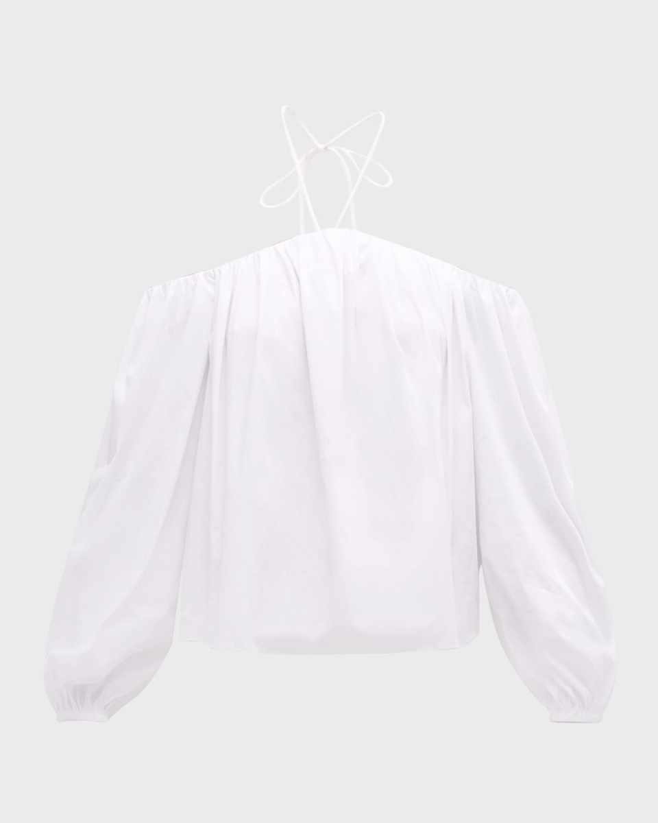 SIMONMILLER "Oleander" poplin top features halter tie straps Offtheshoulder neckline Long puff sleeves Elastic cuffs Hip length Relaxed fit Pullover style Cotton/nylon/spandex Machine wash Imported