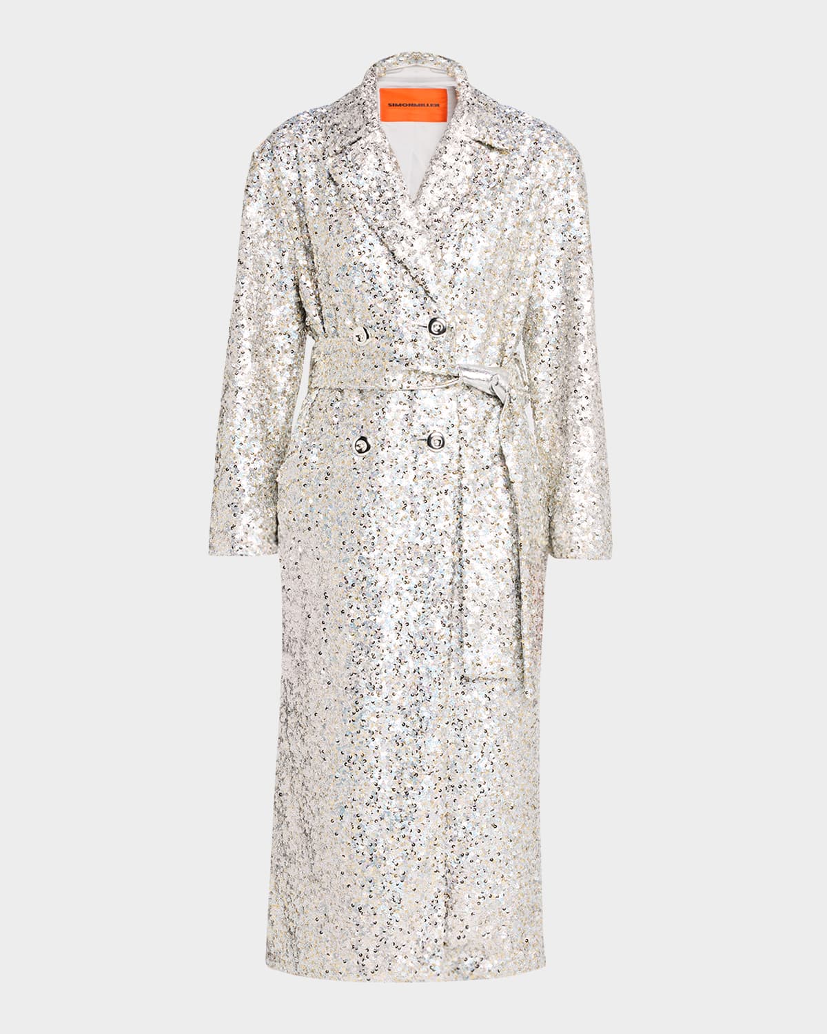 SIMONMILLER "Rhodes" classic trench coat embellished with allover micro paillette circular sequins Notched collar; doublebreasted front Long sleeves Selftie belted waist Front pockets Hem falls below the knee Classic fit Polyester Imported