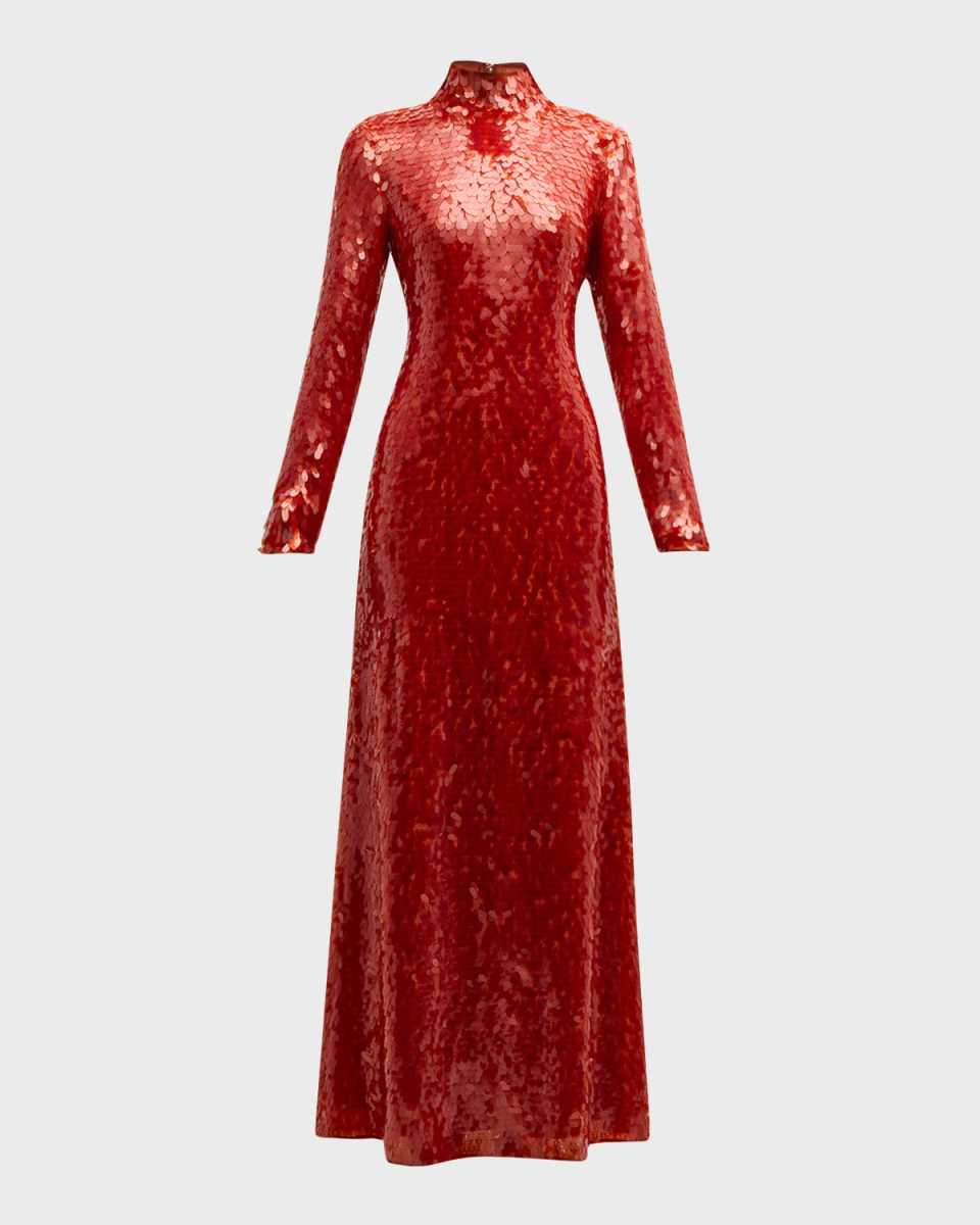 SIMONMILLER "Sculpty" party dress coated with paillette sequins Approx. 62"L from shoulder to hem Mock neckline Long sleeves Floorlength hem Aline silhouette Centerback zipper Polyester Imported