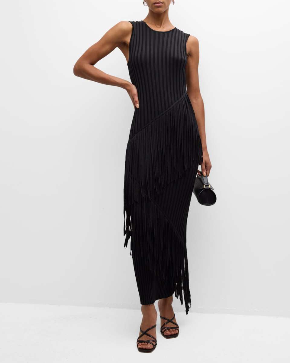 SIMONMILLER "Spiral" knit dress flaunts asymmetric fringe throughout Approx. 51"L from shoulder to hem Crew neckline Sleeveless Full length Sheath silhouette Slipover style Viscose/nylon Machine wash cold Imported
