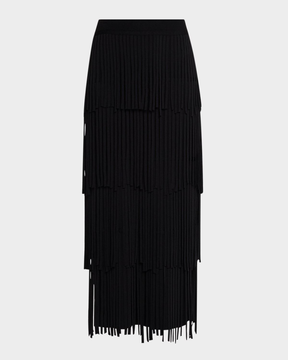SIMONMILLER "Za Za" knit skirt consists of tonal fringed layers Highrise waistband Full length Skirt falls straight from hip to hem Slipon style Viscose/nylon/polyamide Imported