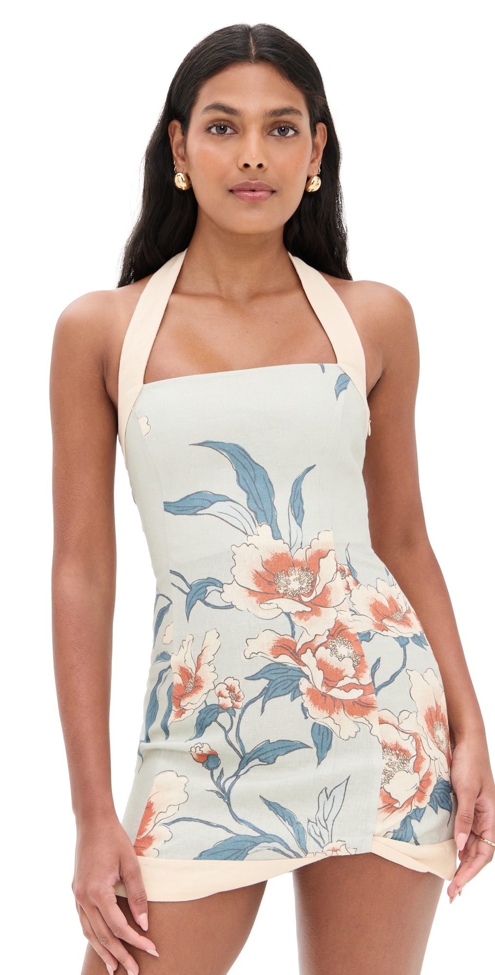 Fabric: Lightweight, non-stretch linen weave. Floral print. Twist detail at hem. Mini length. Halter neckline. Hook-and-eye and hidden zip at back. Shell: 100% linen. Lined. Lining: 100% cotton. Dry clean. Imported, China. Measurements: Measurements from size 0 Length: 21.25in / 54.0cm, from center back