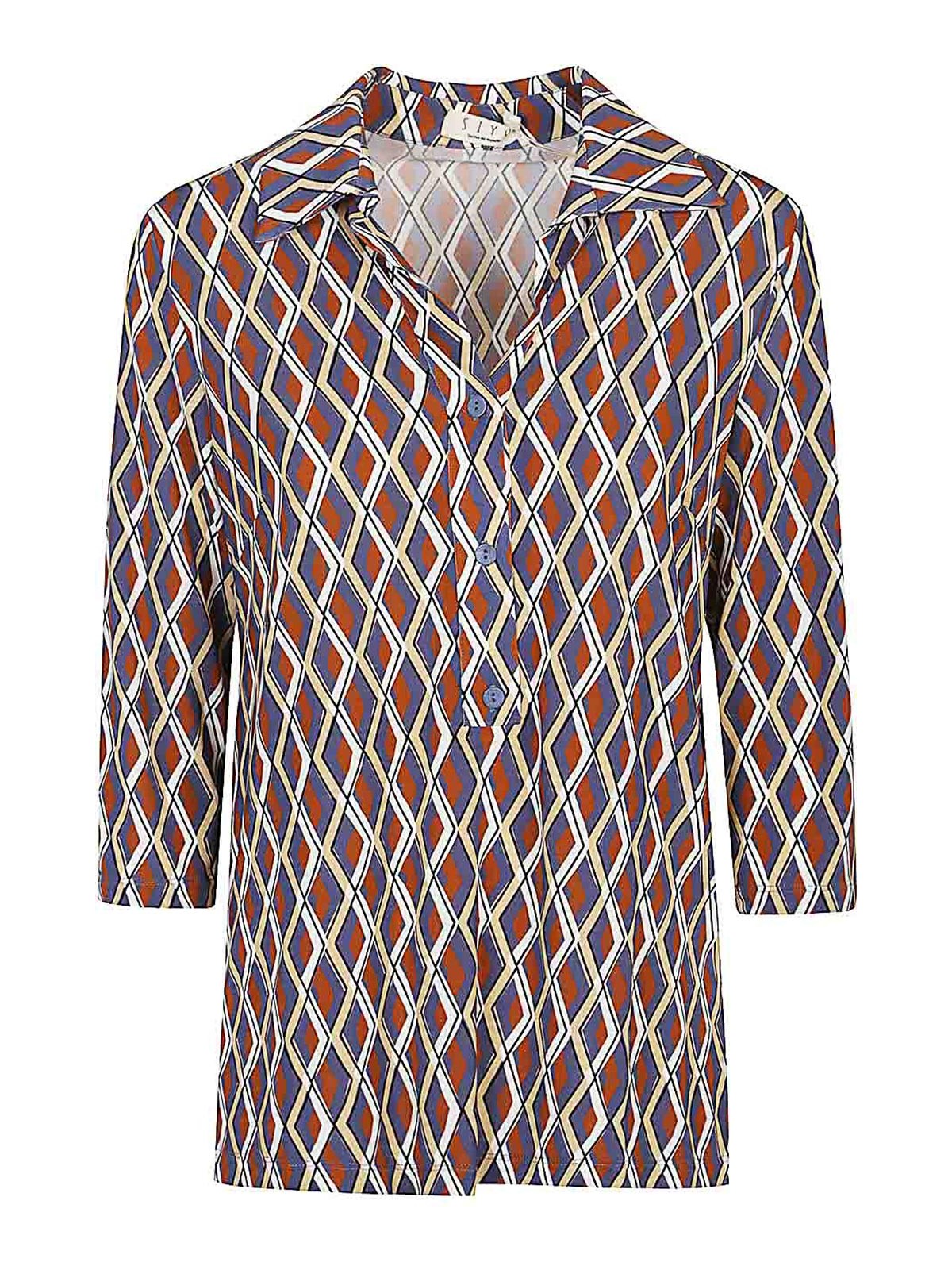 Chemise en viscose multicolore, col polo, fermeture boutonnée sur le devant, manches 3/4, fentes latérales, ourlet droit, coupe décontractée.