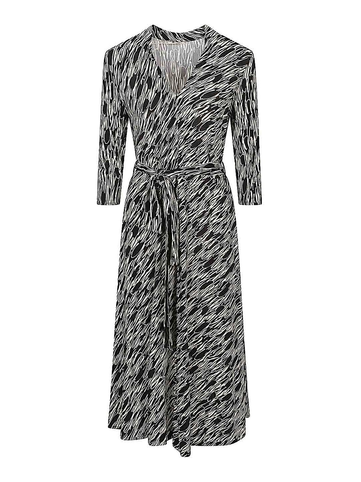 Robe longue à imprimé multicolore intégral, en viscose, col en V, manches 3/4, ceinture en viscose multicolore, ourlet droit.