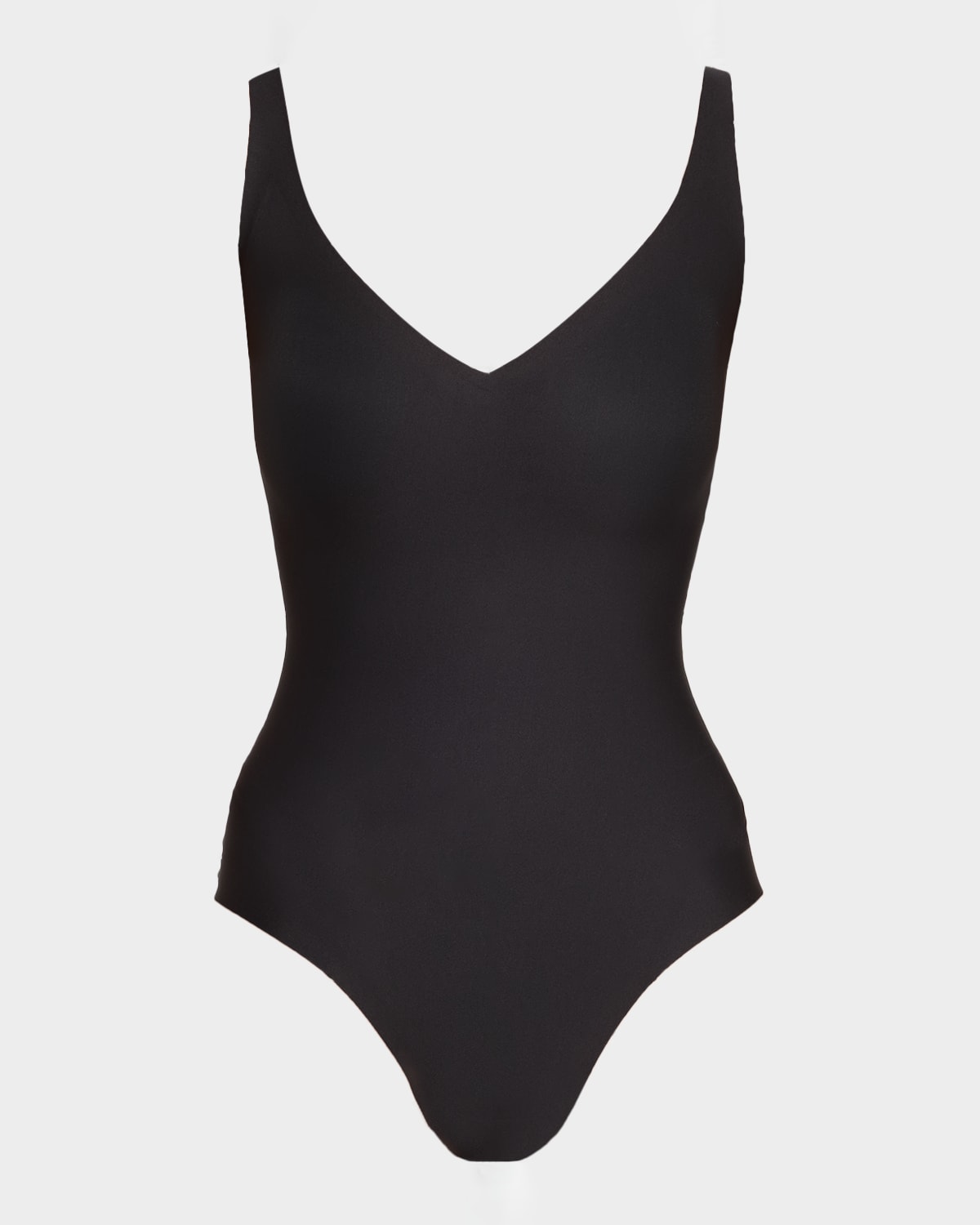 SKIMS bodysuit provides midlevel compression and support to shape the figure V neckline Sleeveless Adjustable straps Highcut legs Minimal seat coverage Formfitting Snap gusset Nylon/polyamide/elastane Imported
