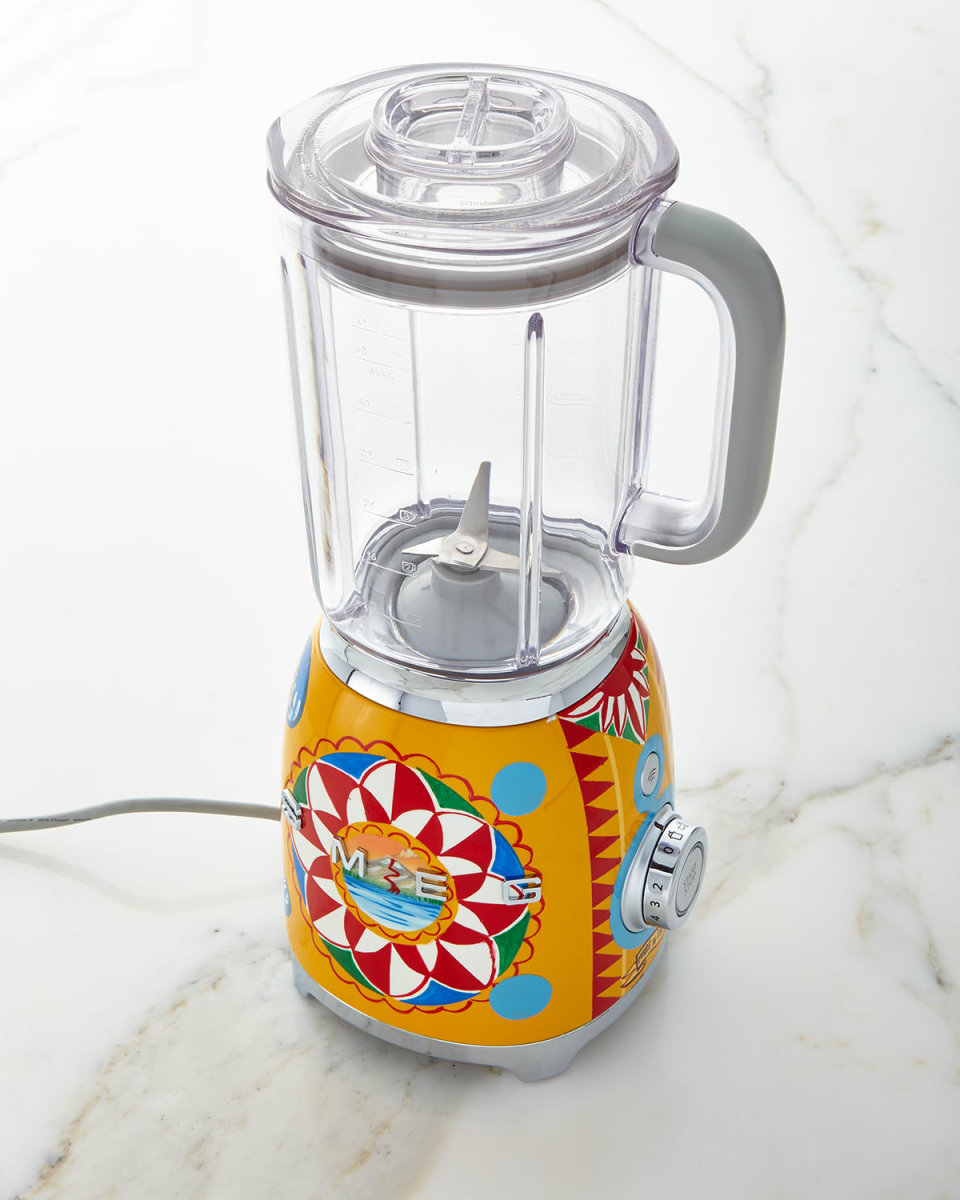 SMEG blender in collaboration with Dolceamp;Gabbana. From the Sicily is My Love collection. As awarded by The Chicago Athenaeum: Museum of Architecture and Design. Silk screen and lithography decoration. Diecast aluminum powdercoated body. Backlit chrome knob. Technical characteristics 1.5 liters/48 ounces/6 cups Tritan™ BPAfree jug. Transparent lid with measuring cup. Stainless steel dual blades, detachable. Safety lock when removing blender jug. Overload motor protection. Motor with Smooth Start function. Builtin cord wrap. Antislip feet. Power 800 W. 10"W x 11"D x 14"T. Dishwasher safe. Made in Italy.