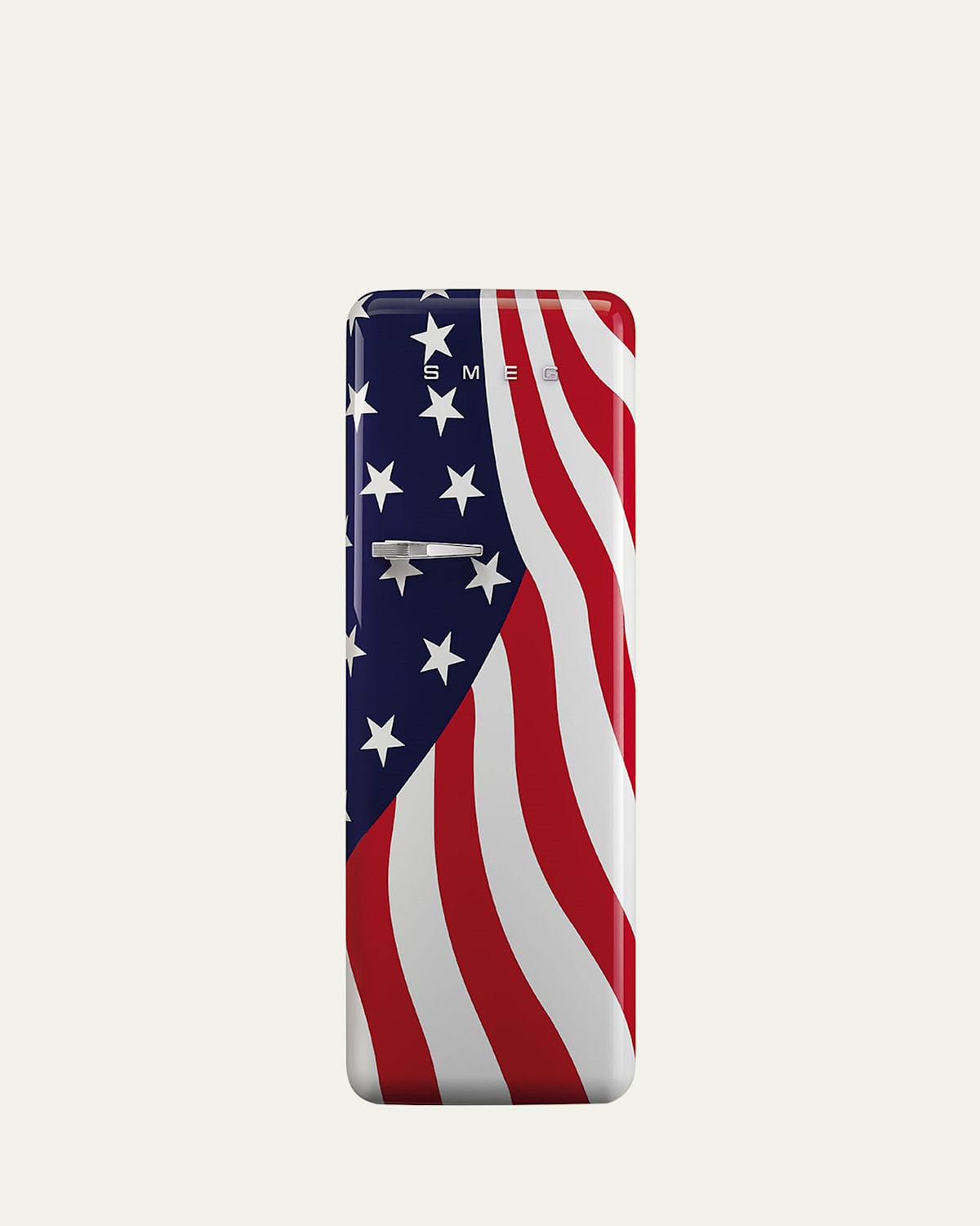 The FAB28 colored retrostyle refrigerators have become a cult object of style and creativity. Rounded curves and chrome details perfectly coordinate the interior and exterior doors of the refrigerator. This version features a specialedition US Flag colorway. Cooling: Fanassisted (refrigerator), static (freezer) Defrost: Automatic (refrigerator), manual (freezer) Electromechanical temperature control Two adjustable glass shelves One fruit and vegetable drawer Sliding crisper drawer with glass cover Internal LED light in refrigerator Adjustable covered shelf in refrigerator door Two adjustable door bins with wire support in refrigerator door One bottle shelf in refrigerator door Internal freezer compartment Acoustic and visual "door open" alarm Antibacterial gasket Electronic temperature setting type Hinge position: right Approx. 23.6"W x 30.2"D x 60.2"T Item Weight (Lbs.): 163.0 Steel/plastic/glass Wipe clean Made in Italy Boxed weight, approximately 192.0 lbs