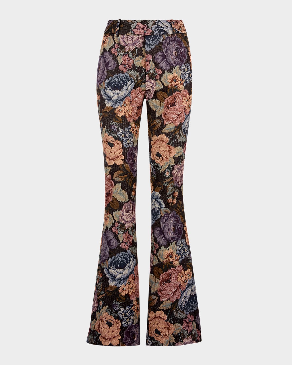 Crafted from stretch floral jacquard, these pants by Smythe feature an elongating bootcut silhouette Approx. 34" inseam Mid rise sits high on hip Full length Fitted through hip; flared from knee Hidden hook/zip fly; belt loops Polyester/cotton/acrylic Unlined Made in Canada