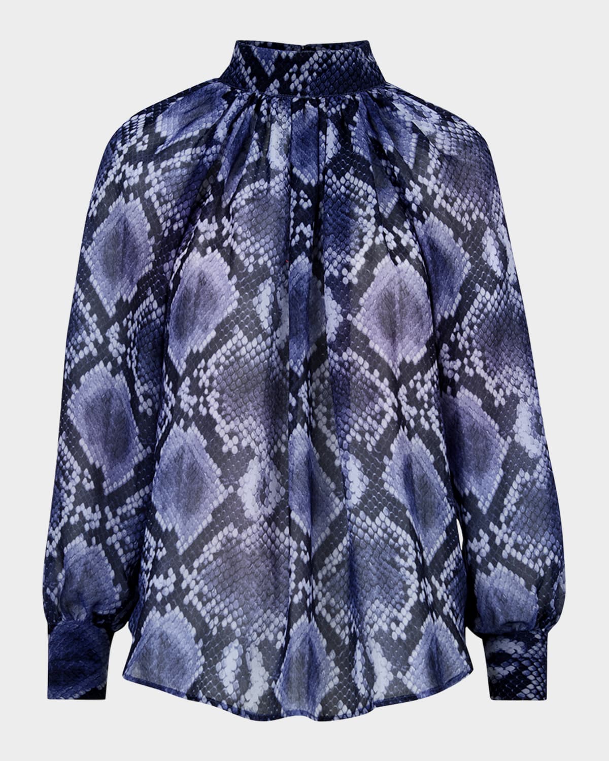 Detailed with elegant gathering, the Kitten blouse by Smythe is cut from snakeprinted diaphanous chiffon Approx. 25"L from shoulder to hem Mock neckline Long balloon sleeves; button cuffs Relaxed fit Hip length Back buttonandloop closure Polyester Unlined Made in Japan