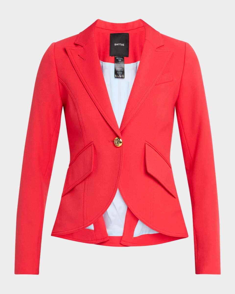Smythe decidedly tailored blazer with signature antique brass buttons Approx. 21.3"L from shoulder to hem Peak lapels; singlebreasted front Chest welt pockets Long sleeves; button cuffs Angled hip flap pockets Midlength Cutaway hem Polyester/viscose/elastane Made in Portugal