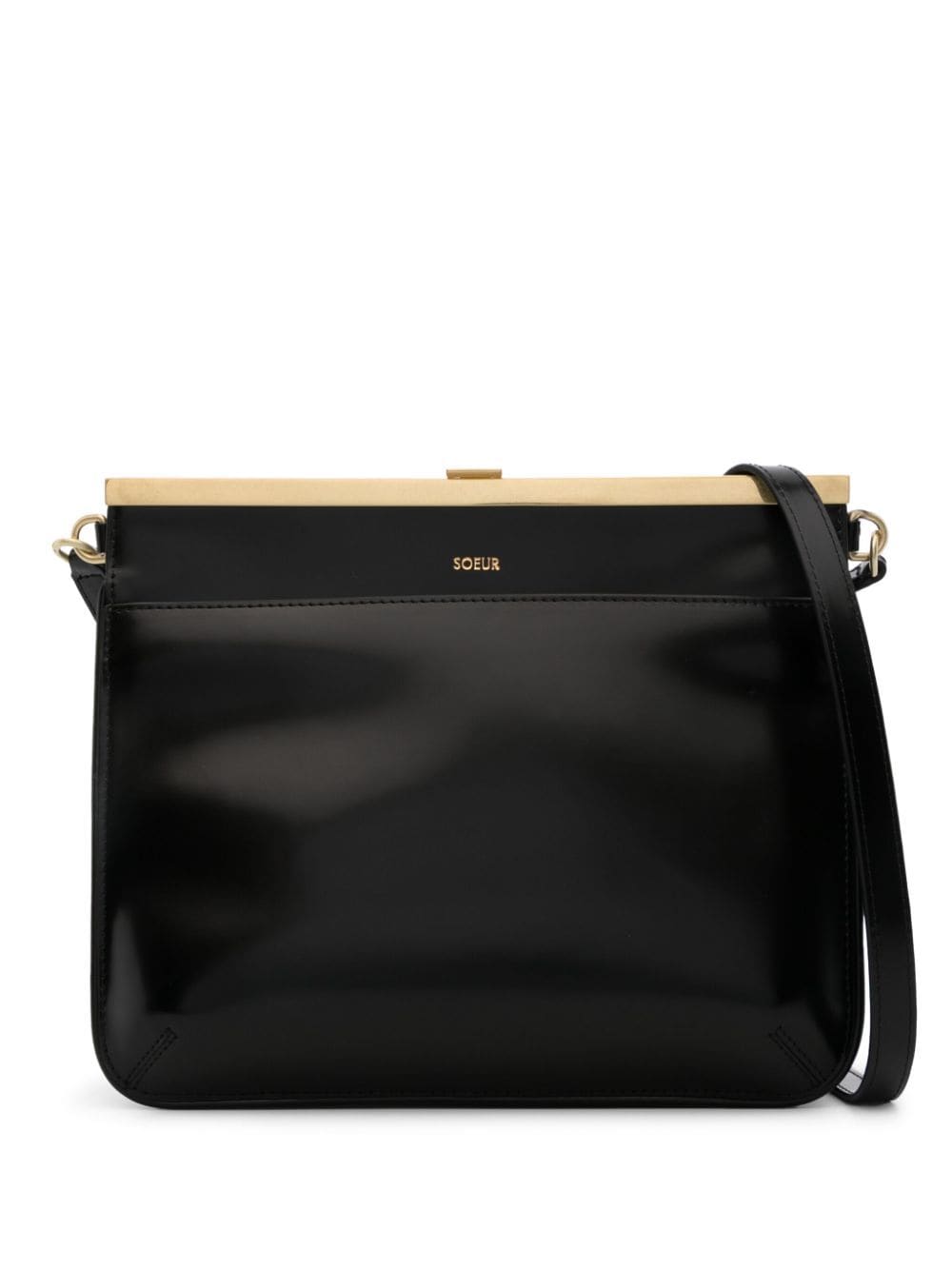 black calf leather brushed effect clasp fastening adjustable shoulder strap logo stamp to the front front patch pocket rear patch pocket main compartment internal patch pocket canvas lining