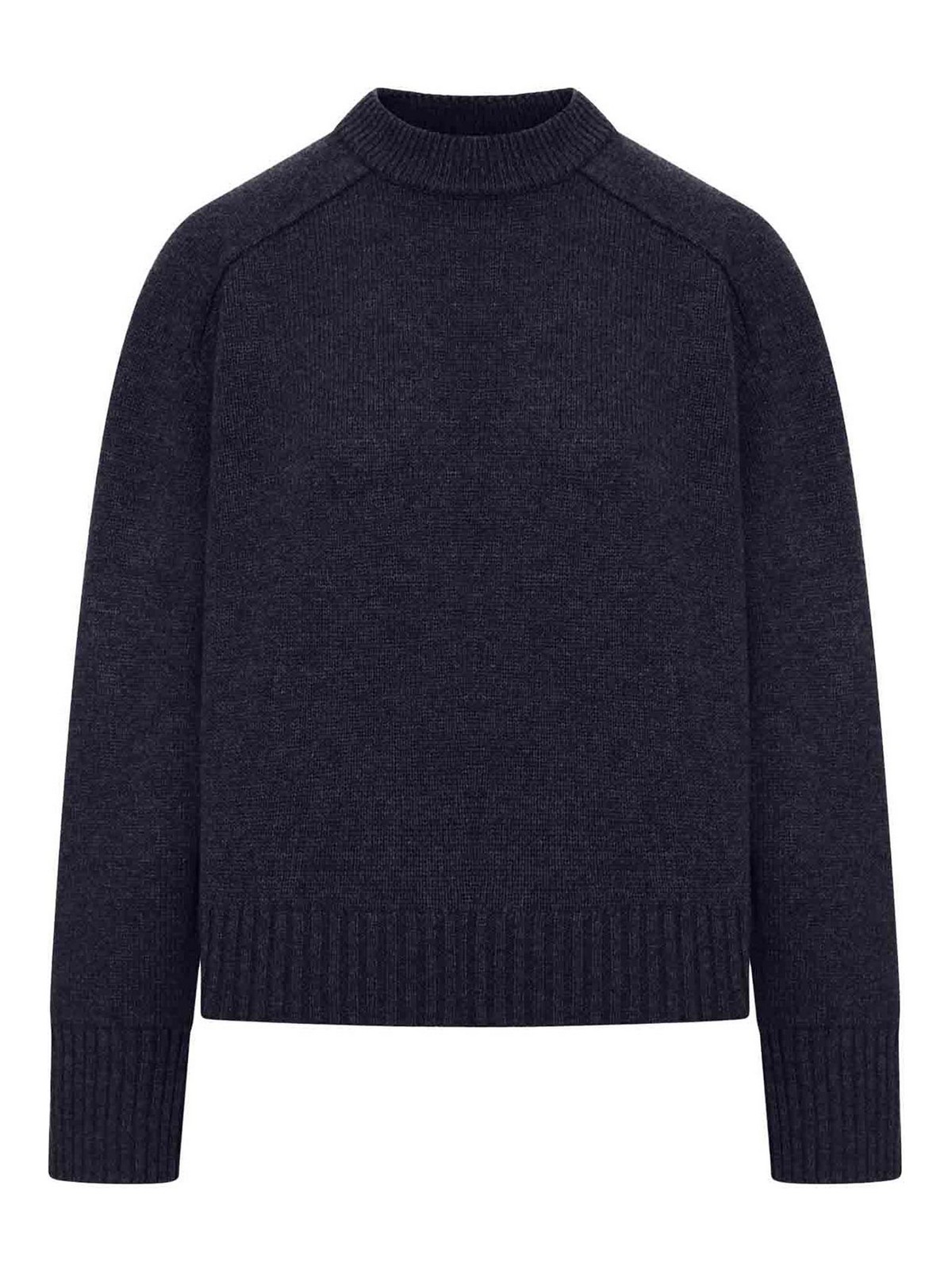 Pull ample, coupe ample droite, col rond, emmanchures basses, bords côtelés, poignets fendus, couleur bleu marine