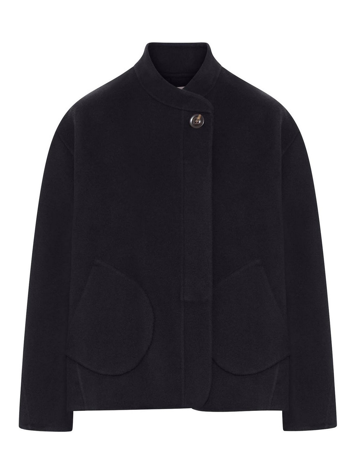 Manteau court, ample et ajusté, manches longues arrondies, montant asymétrique, col montant, cache-caur, ouverture avec demi-boutons cachés, poches plaquées, double face, couleur noire