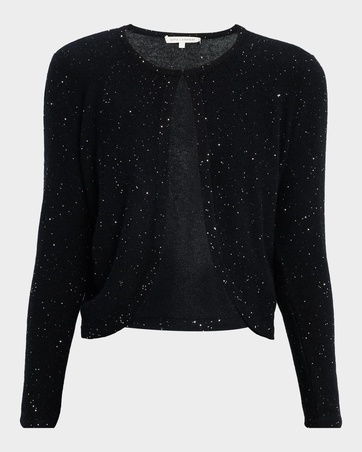 Luxurious cashmere sweater spun with sequined yarns by Sofia Cashmere. Crew neckline Bracelet sleeves; approx. 27"L Classic fit Rounded cutaway hem Front hook closure Cashmere/nylon/polyamide Dry clean Imported