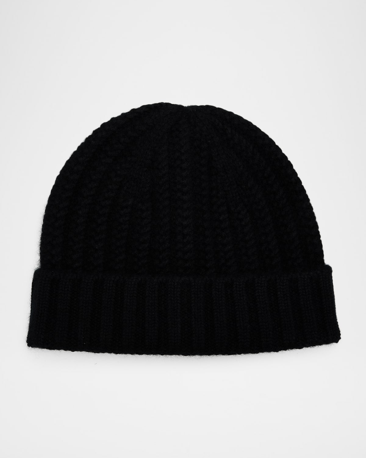 Sofia Cashmere ribbed beanie envelops with a plush cozy knit Round crown Wide foldover cuff Cashmere Dry clean Imported