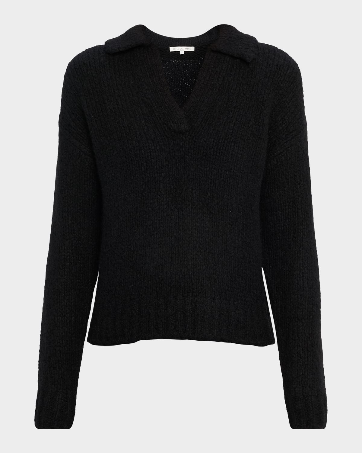 This Sofia Cashmere sweater is knit in novelty boucle yarn, adding soft texture and warmth V neckline with spread collar Drop shoulders Long sleeves; approx. 30.5"L Relaxed fit Pullover style Wool/cashmere/silk Dry clean Imported