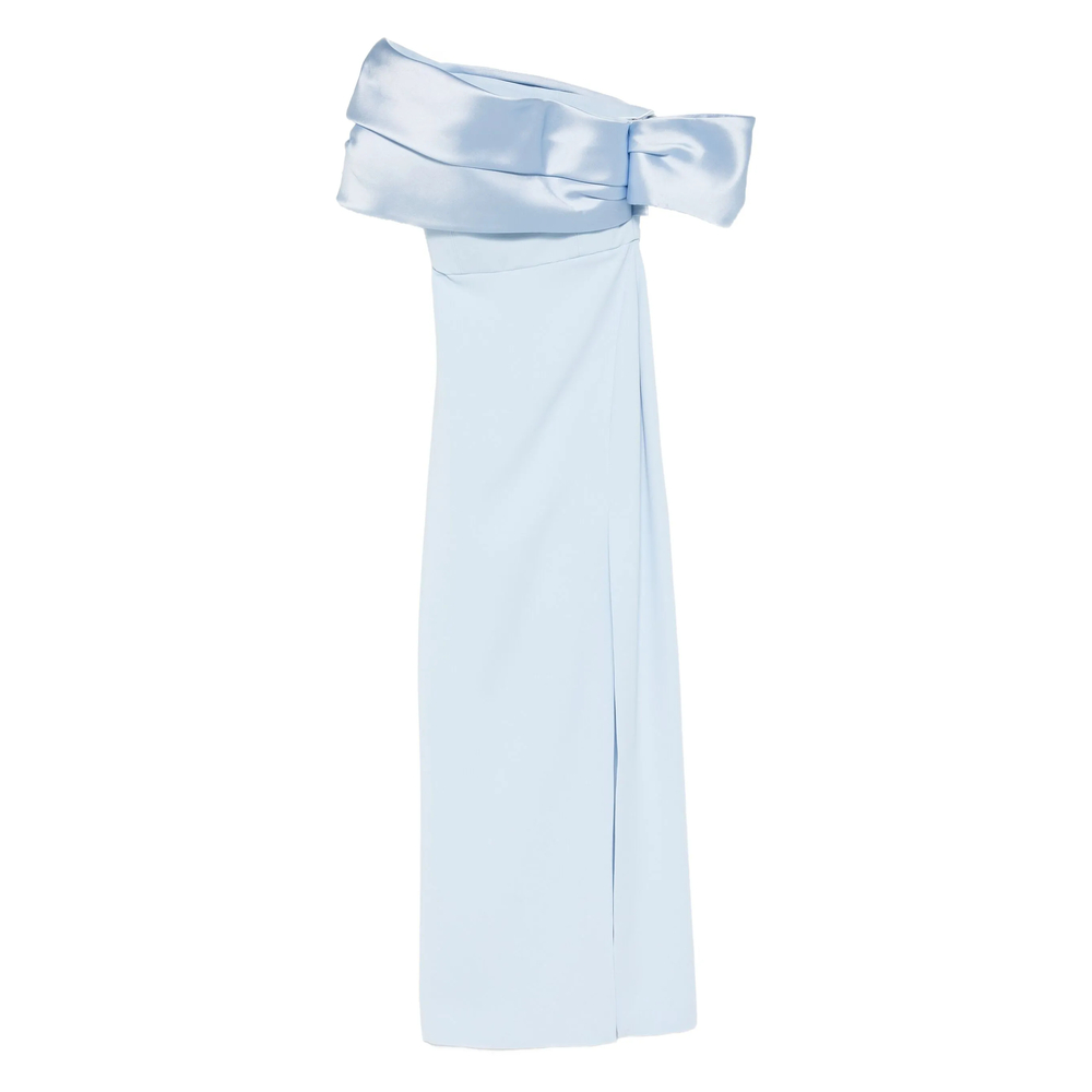 light blue off-shoulder draped detailing side slit tonal stitching straight hem