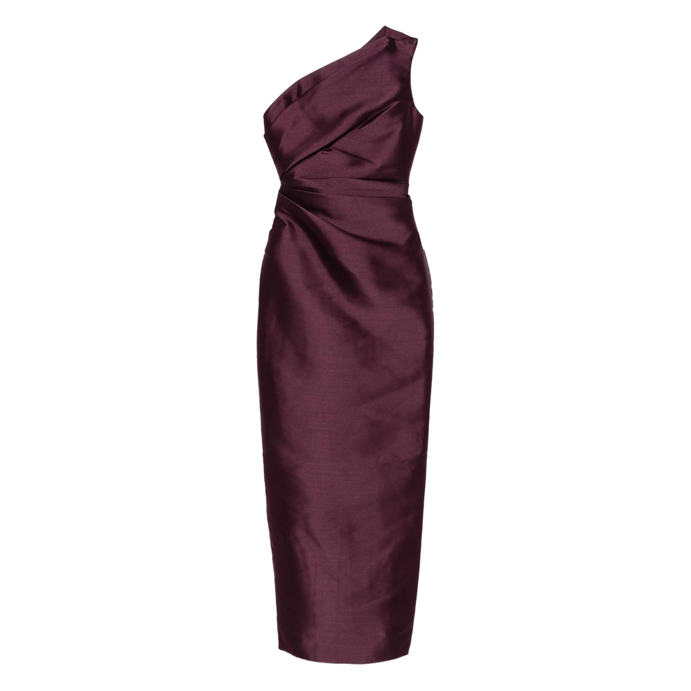 burgundy one-shoulder neckline draped bodice maxi length straight hemline