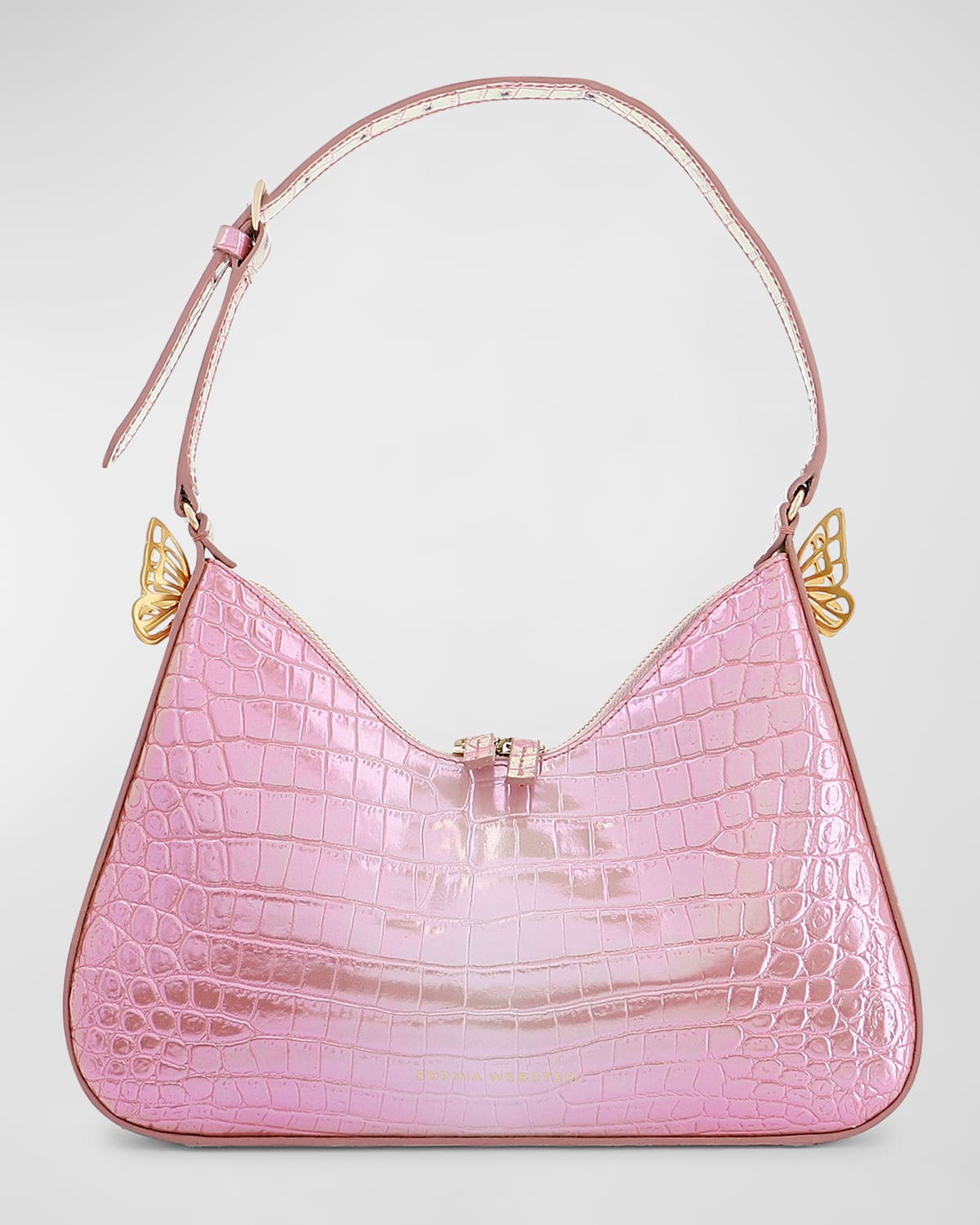 Sophia Webster "Mariposa" hobo bag in metallic crocembossed leather Adjustable shoulder strap Twoway zip top closure Exterior, butterfly accent on sides Approx. 9.1"H x 11.8"W x 3.4"D Made in Spain