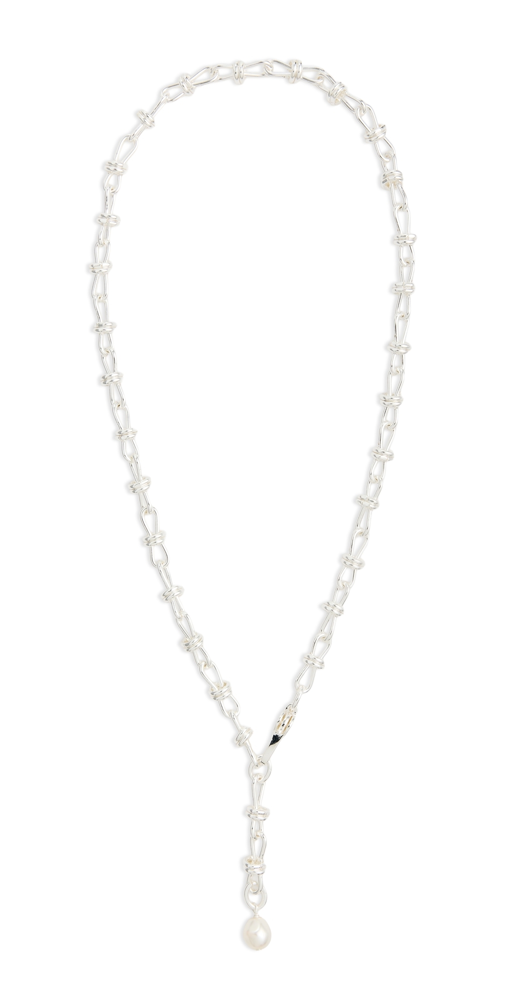 Swarovski pearls. Silver plated brass. Lobster claw clasp. Made in the USA. Measurements: Length: 19.25in / 49.0cm