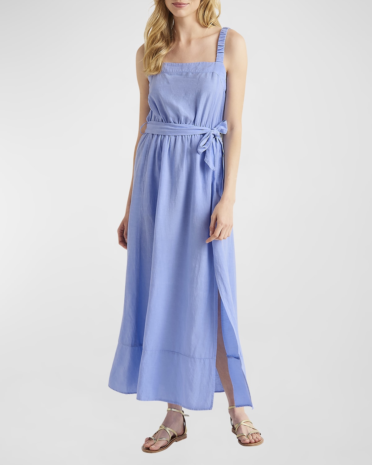 Splendid "Jubi" relaxed dress features a removable selftie belt Approx. 43"L from shoulder to hem Square neckline Ruched elastic straps Side seam pockets Side slit Aline silhouette Maxi length Slipover style Cotton/rayon/linen Machine wash cold Imported