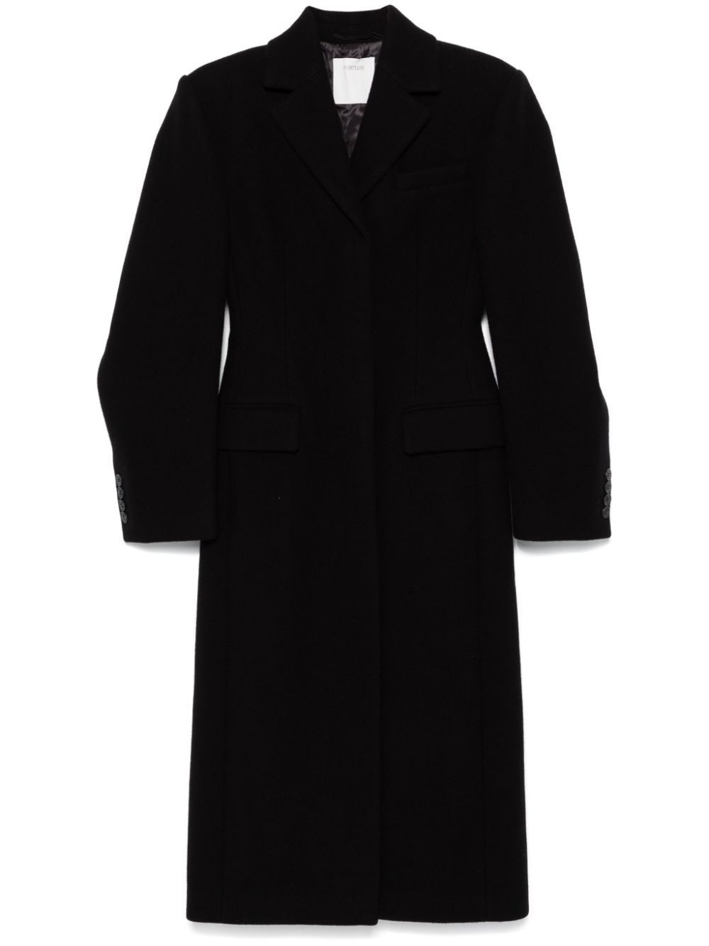 black virgin wool-cashmere blend concealed front button fastening notched lapels long sleeves buttoned cuffs chest welt pocket dart detailing two side flap pockets central rear vent full lining straight hem