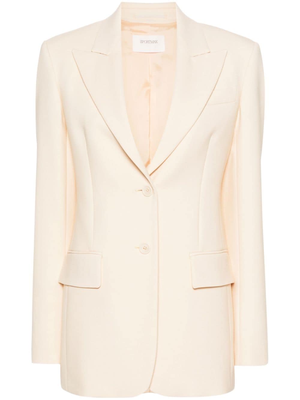 beige virgin wool blend peak lapels shoulder pads long sleeves buttoned cuffs chest welt pocket fitted waistline faux pocket detail central rear vent internal logo tag full lining straight hem front button fastening