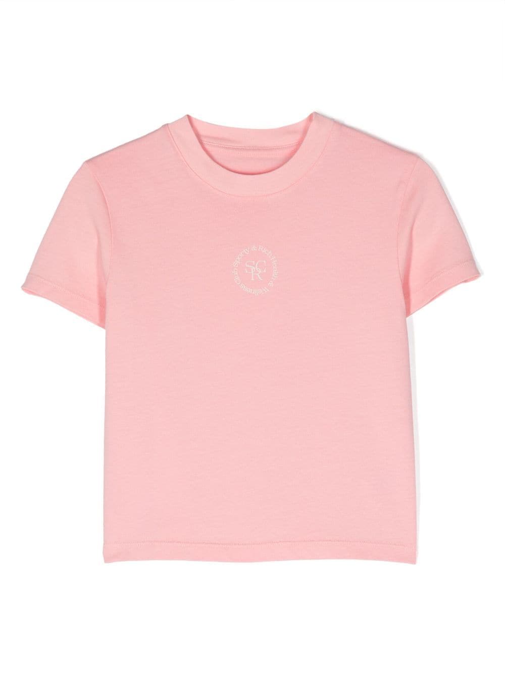 blush pink cotton jersey knit logo print to the front round neck short sleeves straight hem
