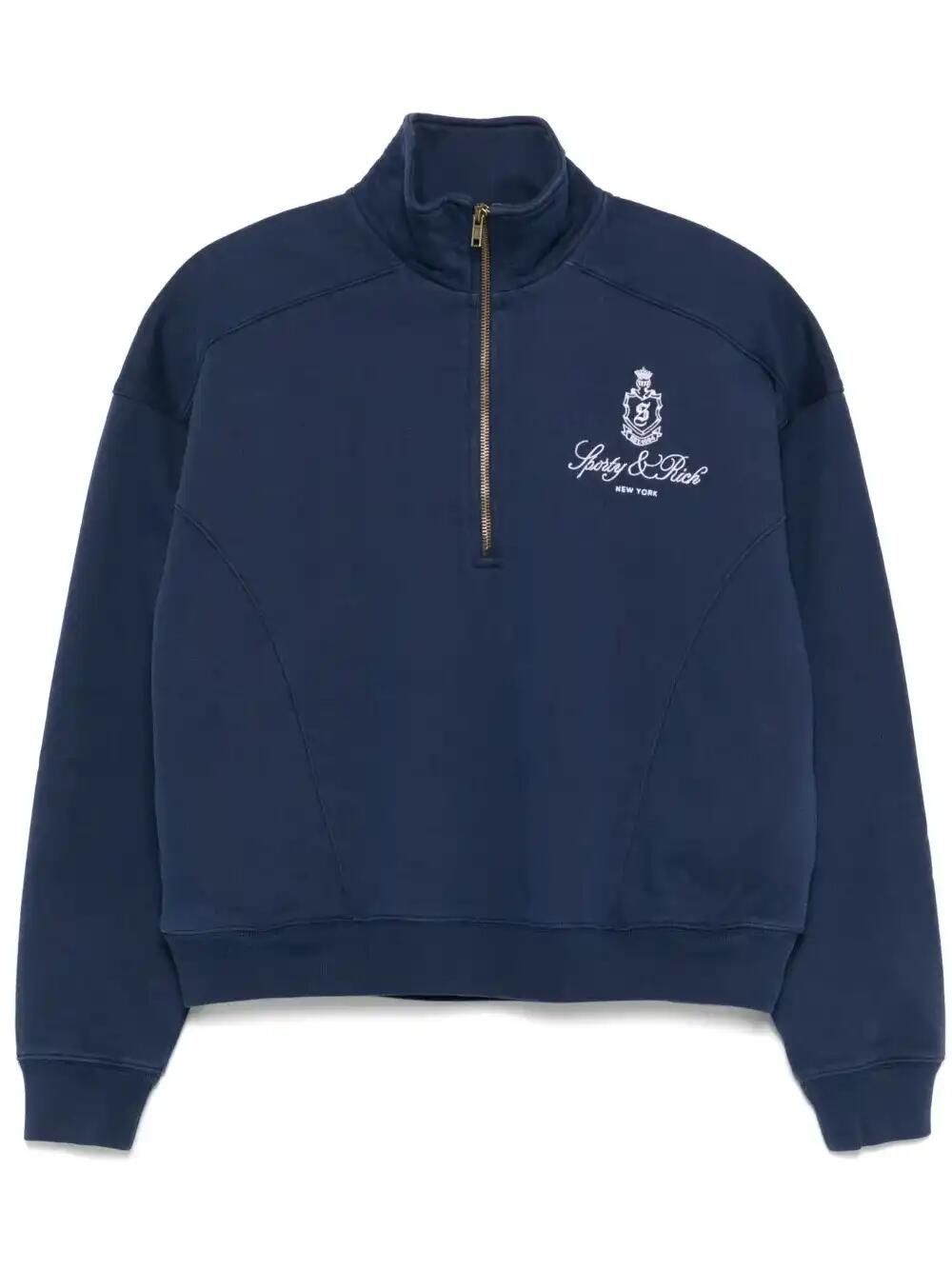 navy blue half front zip fastening high neck two side slit pockets embroidered logo at the chest