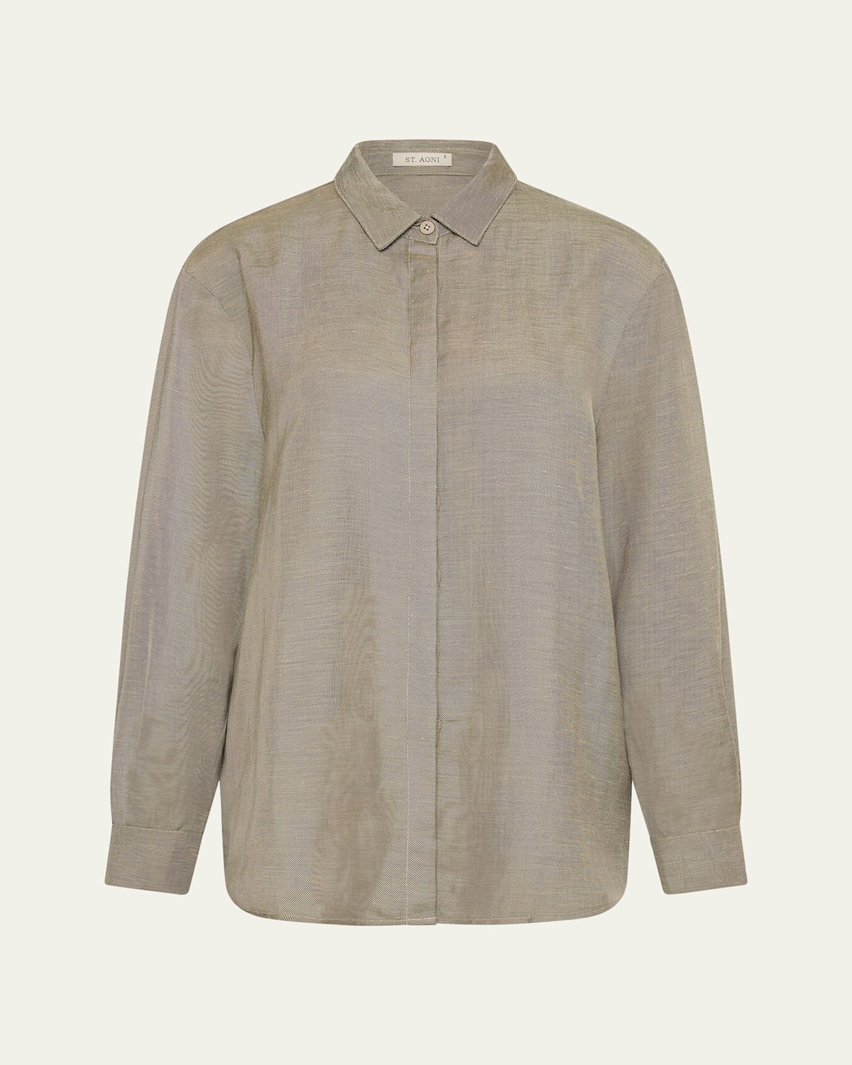 St. Agni classic shirt Point collar Long sleeves with button cuffs Relaxed fit Hem falls to the hip Concealed buttonfront Viscose/linen Dry clean or machine wash warm Imported