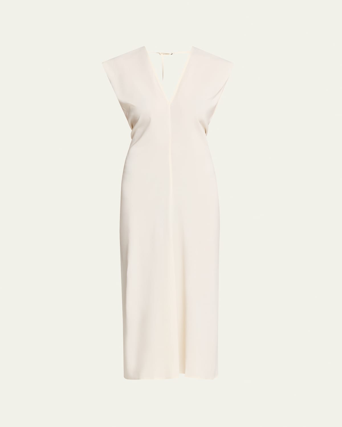 St. Agni draped maxi dress finished with an openback V neckline Cap sleeves Adjustable back strap Column silhouette Full length Center back zip Viscose/spandex Unlined Dry clean Imported