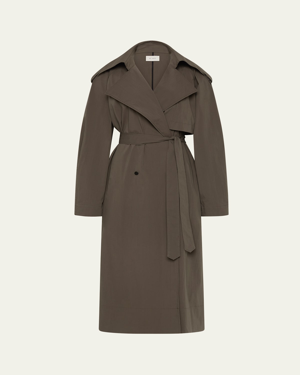 St. Agni softtailored trench coat Wide notch lapels Doublebreasted front Long sleeves Front and back rain flap Selftie belt Relaxed fit Vented back Concealed buttonfront Cotton/nylon/polyamide/spandex Unlined Imported