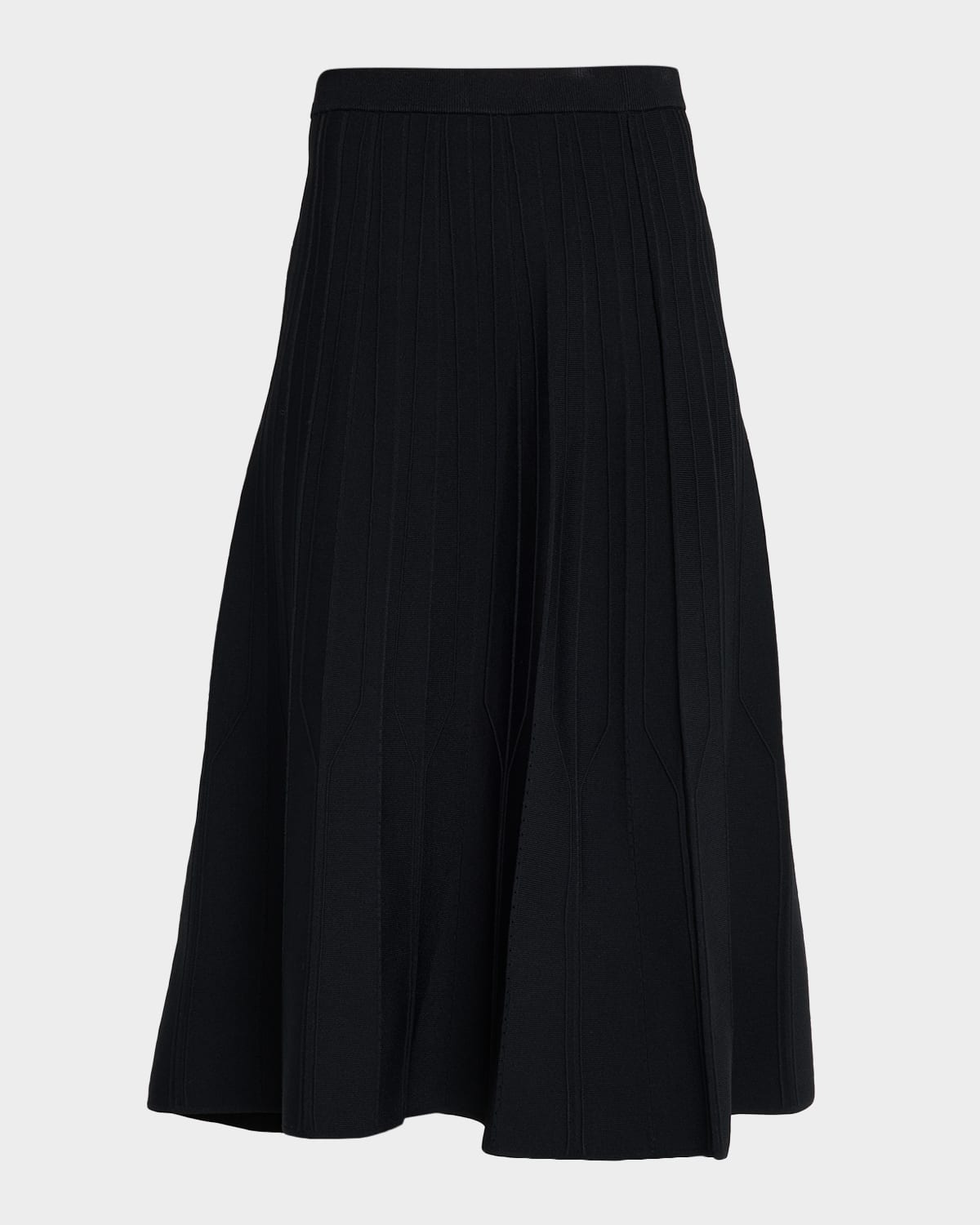 St. John knit midi skirt with seam details High rise Elastic waistband Aline silhouette Hem falls below the knee Pullon style Viscose/elastane Professional cleaning recommended Imported